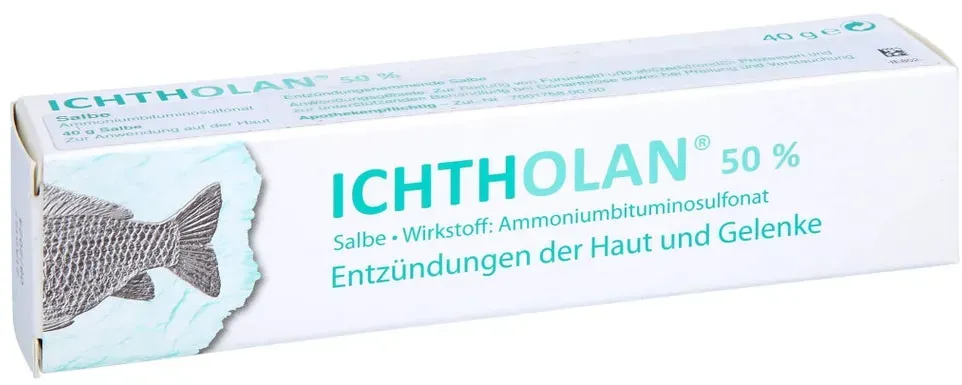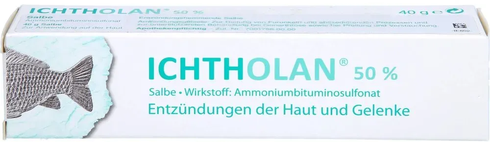 447.75 / 1 kg - Kategorie: Arzneimittel - EurimPharm Arzneimittel GmbH - GTIN:4150139076417 - PZN:13907641 - 13907641: EurimPharm Arzneimittel GmbH - ICHTHOLAN 50% Salbe 40 g - 17,91 Euro bei UnserekleineApotheke - gefunden von billiger.de Dieses Angebot bietet eine 40g-Packung eines Reimports zu einem sehr guten Preis. ![]() ![]() KOHLPHARMA GMBH ICHTHOLAN 50% Salbe 40 g