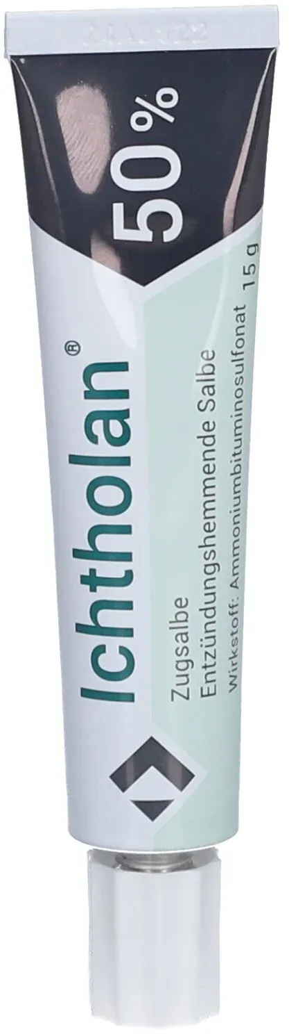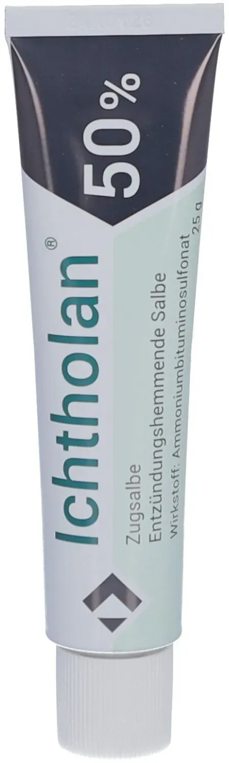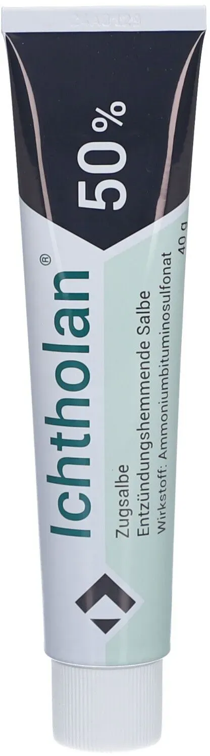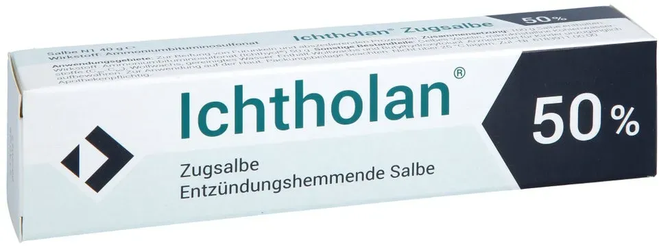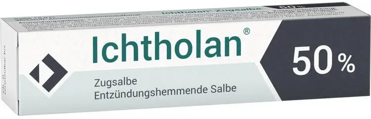 583,60 /kg - Kategorie: Arzneimittel - Ichthyol-Gesellschaft Cordes Hermanni & Co. (GmbH & Co.) KG - GTIN:4150190939782 - PZN:19093978 - Ichtholan 50 % Salbe Zur Behandlung von Furunkeln und PrellungenIchtholan 50 % ist eine hochwirksame schwarze Zugsalbe mit dem Wirkstoff Ammoniumbituminosulfonat (Ichthyol ), der aus natürlichem Schiefergestein gewonnen wird. Diese Salbe eignet sich ideal zur Reifung von Furunkeln und oberflächlichen Abszessen sowie zur unterstützenden Behandlung bei Gonarthrose, Prellungen und Verstauchungen. Die entzündungshemmende, antibakterielle und schmerzlindernde Wirkung fördert die Heilung und verbessert die Durchblutung der betroffenen Bereiche.Nebenwirkungen:Hautreizungen oder allergische Reaktionen können auftreten.Enthält Wollwachs und Butylhydroxytoluol, die Hautreaktionen hervorrufen können.Wirkstoffe:Wirkstoff: Ammoniumbituminosulfonat 50 g pro 100 gHilfsstoffe: Wollwachs, ButylhydroxytoluolZusammensetzung:100 g Salbe enthalten 50 g Ammoniumbituminosulfonat sowie Hilfsstoffe wie Wollwachs und Butylhydroxytoluol.Anwendung:Bei Furunkeln und Abszessen: Salbe dick auftragen und mit luftdurchlässigem Pflaster oder Verband abdecken.Bei Gonarthrose, Prellungen und Verstauchungen: Dick auftragen, Verband anlegen und nach 3 Tagen wechseln.Aufbewahrung:Außerhalb der Reichweite von Kindern aufbewahren.Flecken können mit heißem Wasser entfernt werden. Bei eingetrockneten Flecken ggf. Gallseife, Eukalyptusöl oder mildes Bleichmittel verwenden.Nicht bei ... Dieses Angebot ist das günstigste für die 40g-Packung und somit ideal für Anwender, die eine größere Menge benötigen. ![]() ![]() Ichthyol-Gesellschaft Cordes Hermanni & Co. (GmbH & Co.) KG Ichtholan Zugsalbe 50 % 40 g