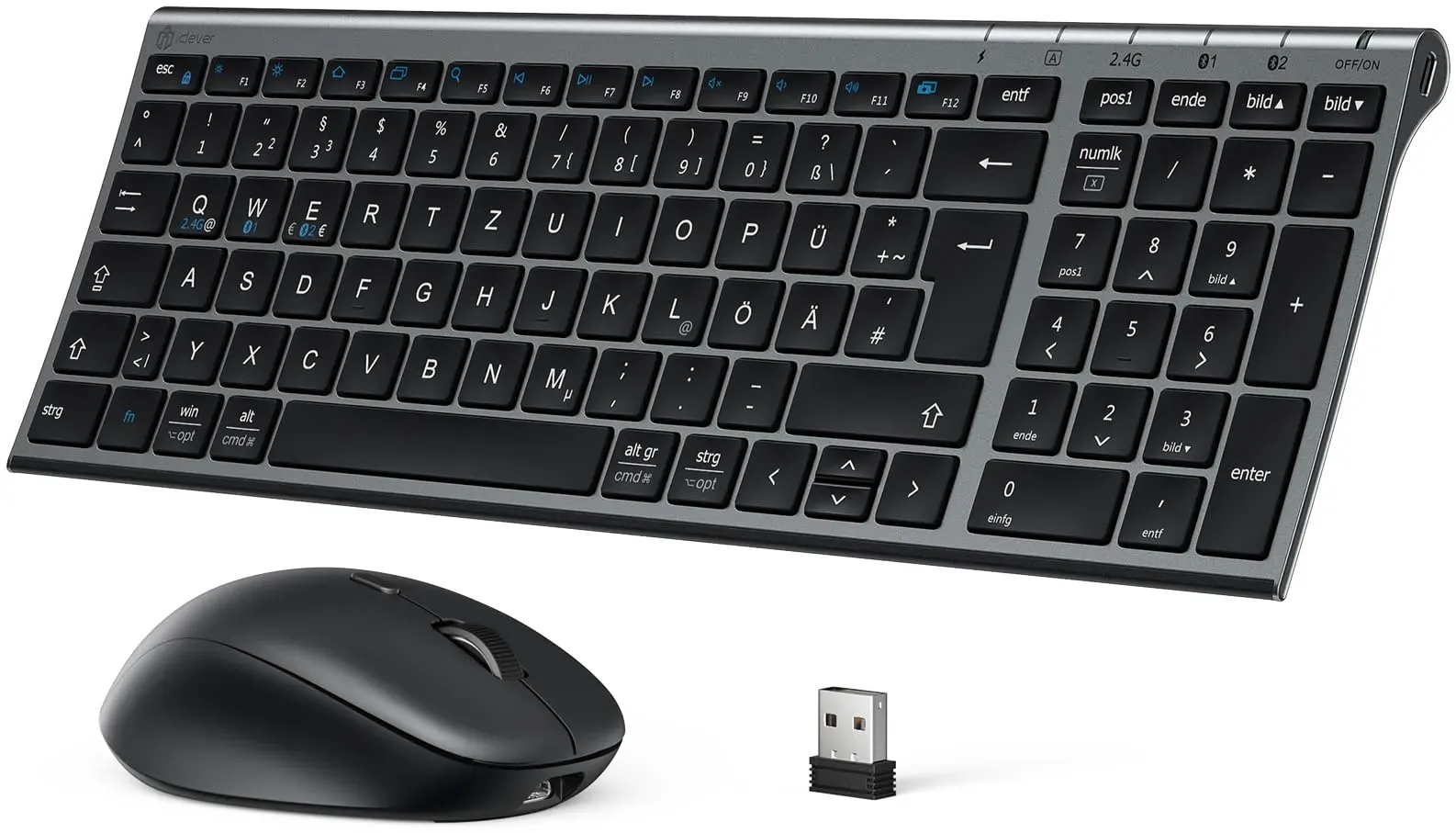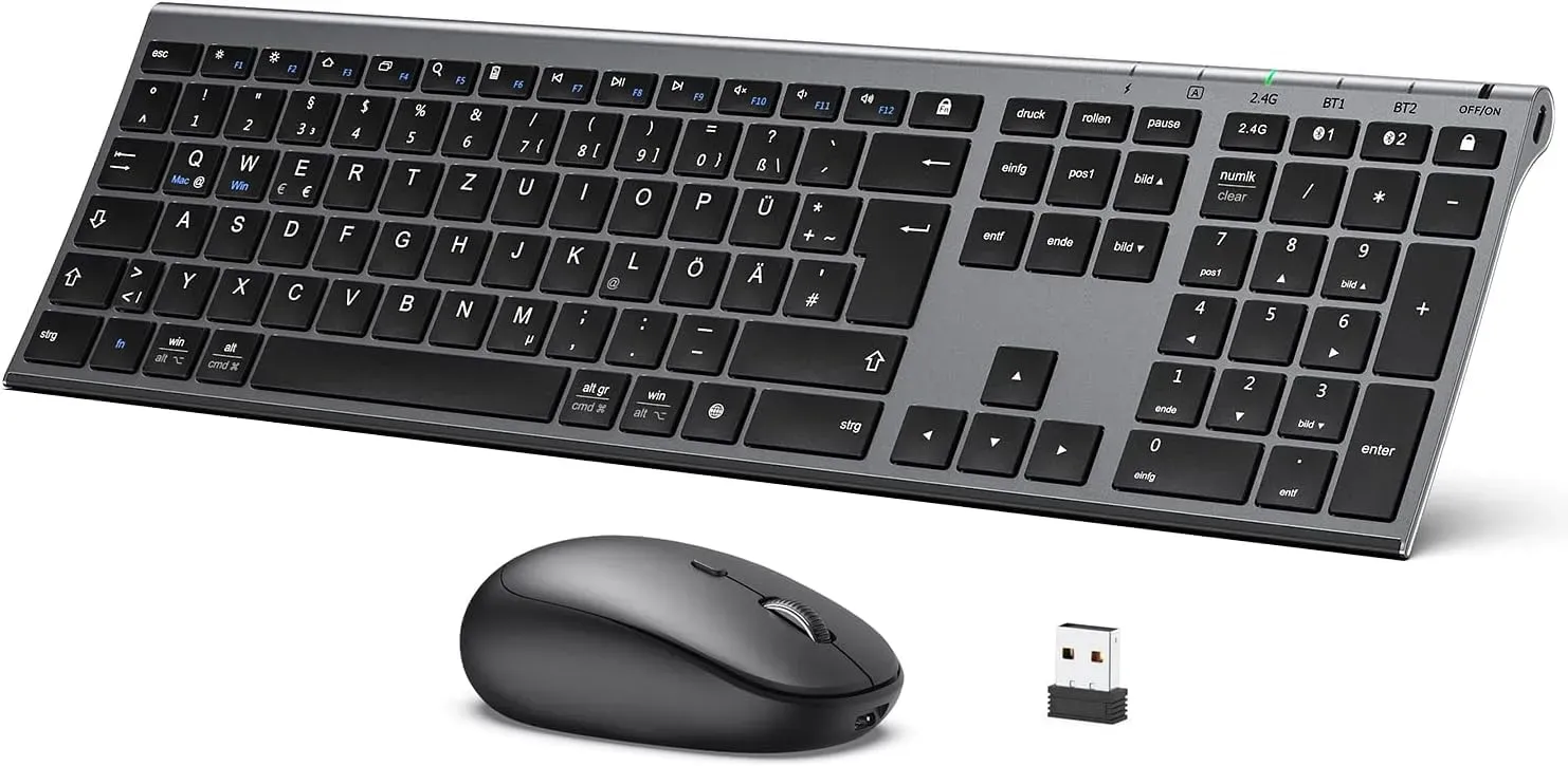 Auf Lager Versand durch AmazoniClever Bluetooth Tastatur mit Maus, Tastatur Maus Set Kabellose Wiederaufladbare Dualmodus (Bluetooth+2.4G), Extrem-Dünne Multi-Funktionale für Mac, Andoid, Windows, QWERTZ Layout, Grau