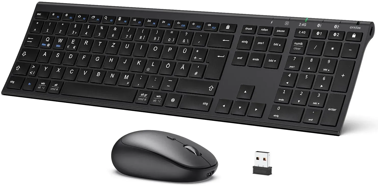 Zustand: Neu - Elektronik & Foto: Produkte mit Umwelt-Label - iClever - DK05 Combo - EAN: 6934911796636 - Bluetooth Tastatur mit Maus für bis zu 3 Geräten - Dies iClever Tastatur Maus Set kabellos verfügt über 2.4G/ BT1/ BT2 Verbindungskanäle. Sie können eine stabile Verbindung zwischen dem Funktastatur mit Maus mit bis zu drei Geräten herstellen, was die Arbeitseffizienz verbessert und Büroraum spart. Hinweis: Der USB Empfänger befindet sich im Box an der Unterseite der Maus Universelle Kompatibilität - Diese kabellose Tastatur und Maus sind kompatibel mit Windows XP/Vista/7/8/10+, Mac OS 10.10+, iPad OS/iOS 13.0+, Android 4.3+. Es funktioniert mit Laptop, Tablet, MacBook Pro/Air, iPad, iPhone, um Ihre verschiedenen Bedürfnisse zu erfüllen. USB-C wiederaufladbar: Der eingebaute Akku bietet mit einer einzigen Ladung eine Nutzungsdauer von mindestens 180 Tagen und minimiert so Unterbrechungen in Ihrem Arbeitsablauf. Für zusätzliche Effizienz wechselt die Maus nach 10 Minuten in den Ruhemodus (die Tastatur nach 2 Stunden) und erwacht bei jedem Tastendruck. Langlebig & Komfortable - Diese Bluetooth Tastatur besteht aus robusten Metallbasis und hochwertigen ABS-Tasten, sieht elegent und langlebig aus. Dank der leisen Scherenstruktur-Tasten und ergonomischer Ständer bietet die kabellose Tastatur komfortables und reaktionsschnelles Tippen Ultraschlankes Tastatur Maus Set - Die dünnste Stelle der kabellose Tastatur beträgt nur 4 mm, was stilvoll, elegant und einfach aussieht. ... ![]() ![]() iClever Bluetooth Tastatur mit Maus, Tastatur Maus Set Kabellose Wiederaufladbare Dualmodus (Bluetooth+2.4G), Extrem-Dünne Multi-Funktionale für Mac, Andoid, Windows, QWERTZ Layout, Grau