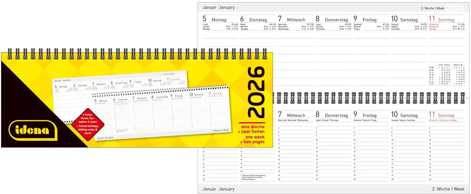 5 Händlerangebote bei billiger.de - Kategorie: Organizer - IDENA - Bürokalender im Querformat 29,8 x 10,5 cm für das Jahr 2026, 4-sprachig in Deutsch, Englisch, Französisch und Italienisch Pro Woche 2 Seiten: Je Wochentag eine Spalte mit 15 Zellen und Zeiteinteilung von 7:00 bis 20:00 Uhr sowie eine Spalte mit 7 Zeilen für Notizen Jede Kalenderseite enthält eine Wochenzählung (Kalenderwoche), Sonn- und Feiertage werden farbig in Rot hervorgehoben Inklusive Jahres- und Monatsübersicht, Schulferien, Feiertagen und Notizseiten Insgesamt 128 Seiten aus 80 g/m2 FSC zertifiziertem Papier in Weiß mit einer Spiralbindung für leichtes Blättern - GTIN:4064997120598 ![]() ![]() Idena 12059 - Tischkalender 2026 quer im Format 29,8 x 10,5 cm, pro Woche 2 Seiten, Schreibtischkalender mit Jahresübersicht und Spiralbindung