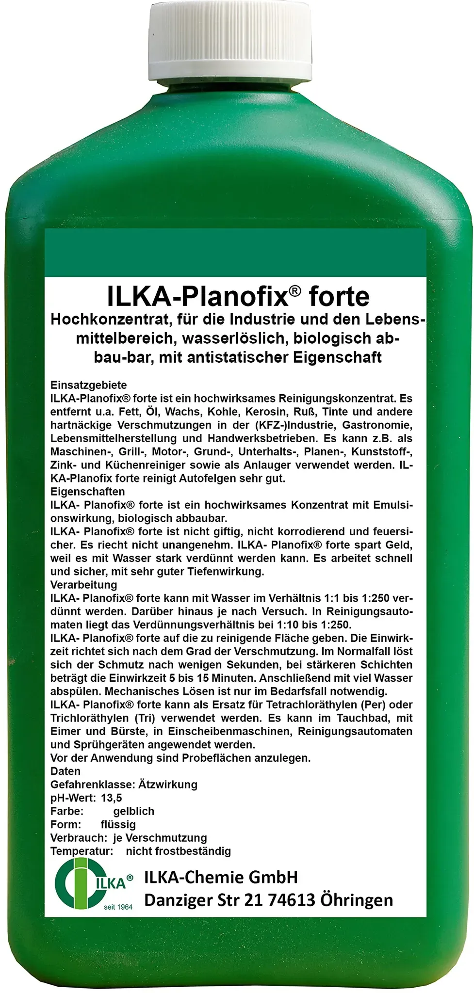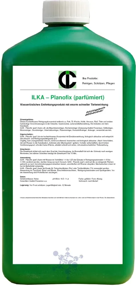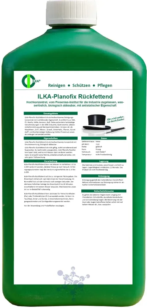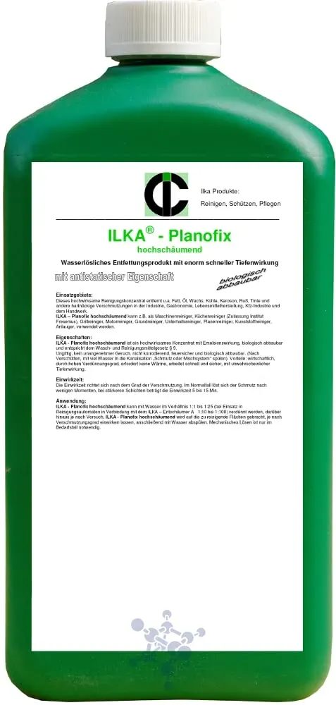 ILKA - EAN: 4250150804171 - . Beseitigt Fett, öl, Wachs, Kohle, Ruß, Tinte und andere hartnäckige Verschmutzungen dank Emulsionswirkung . Optimal in der (KfZ-)Industrie, Gastronomie, Lebensmittelherstellung und Handwerksbetrieben . Verdünnbar im Verhältnis 1:1 bis 1:250 mit Wasser je nach Verschmutzungsgrad . Anwendbar in im Tauchbad, mit Eimer und Bürste, in Einscheibenmaschinen, Reinigungsautomaten und Sprühgeräten . Anwendung als Maschinen-, Grill-, Motor-, Grund-, Unterhalts-, Planen-, Kunststoff-, Zink- und Küchenreiniger (Zulassung Institut Fresenius) sowie als Anlauger oder Felgenreiniger . Kann als Ersatz für Tetrachloräthylen (Per) oder Trichloräthylen (Tri) verwendet werden . Schmutz löst sich nach wenigen Sekunden, bei stärkeren Schichten beträgt die Einwirkzeit 5 bis 15 Minuten . Biologisch abbaubar . Made in Germany Merkmale: Gebinde: Flasche Ausführung: Konzentrat Füllmenge: 1 Liter Duft: frisch Produktform: flüssig weitere Produktinformationen: Besonderheit: biologisch abbaubar Inhalt: 1L, Hinweis: Allzweckreiniger vorsichtig verwenden. Vor Gebrauch stets Etikett und Produktinformationen lesen. - bei bueromarkt-ag.de - aus Yadore Produktdaten Dieses rückfettende 1-Liter-Konzentrat ist besonders empfehlenswert für Oberflächen, die nach der Reinigung einen langanhaltenden Glanz erhalten sollen. ![]() ![]() ILKA-Chemie ILKA® - PLANOFIX rückfettend - Konzentrat | 1 L | universell einsetzbar - Küchenreiniger (Zulassung Institut Fresenius), Motorreiniger, Grundreiniger - mit rückfettender Wirkung für langen Glanz