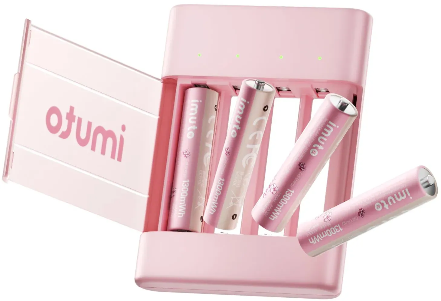 Auf Lager Versand durch Amazonimuto AAA wiederaufladbare Lithium Akkus 4 Stück mit Ladegerät, 1300mWh 1.5V Li-Ionen Triple-A-Batterien, AAA-Batterien mit geringer Selbstentladung und ultraschmalem Ladegerät in Sakura-Design