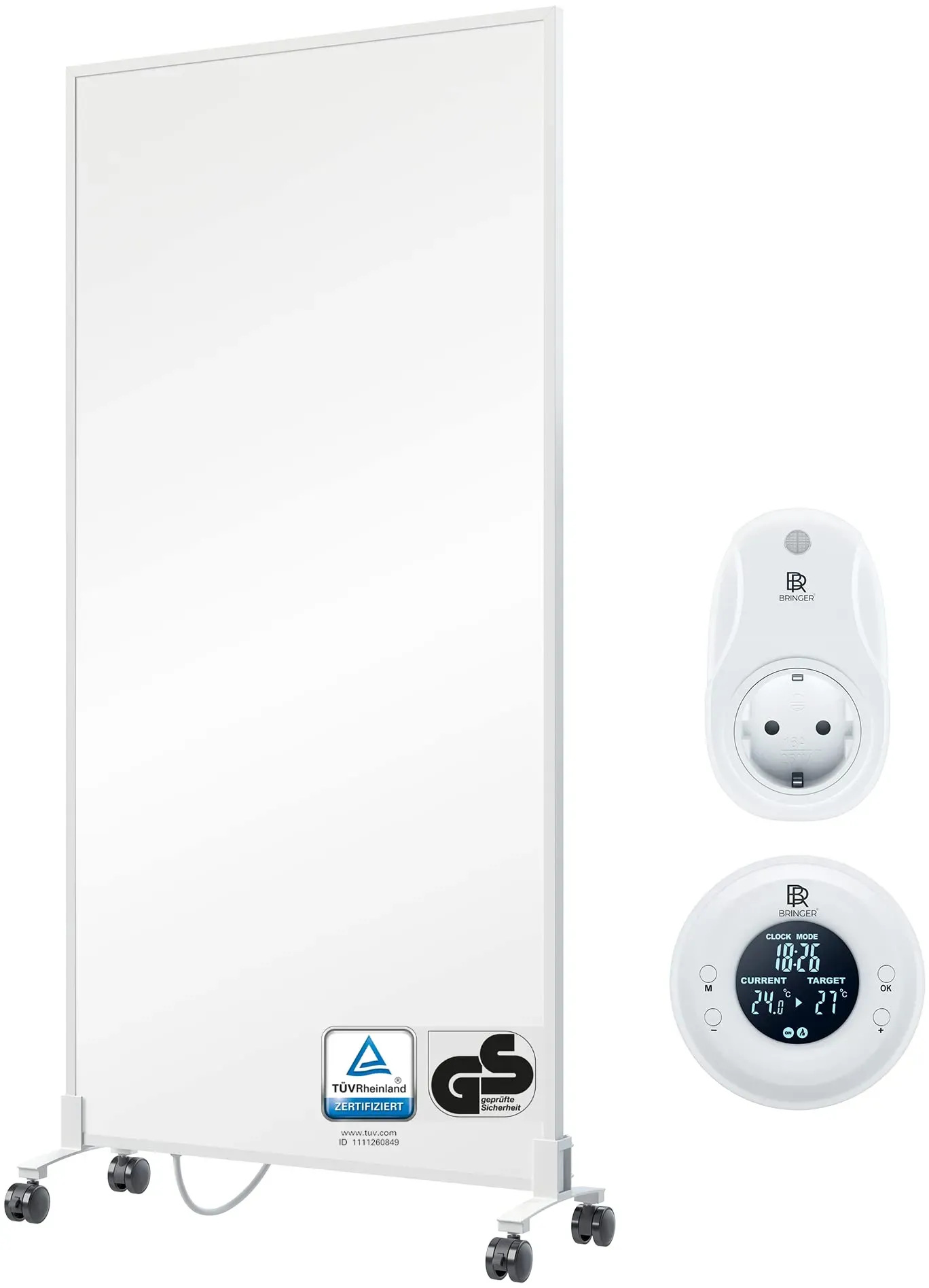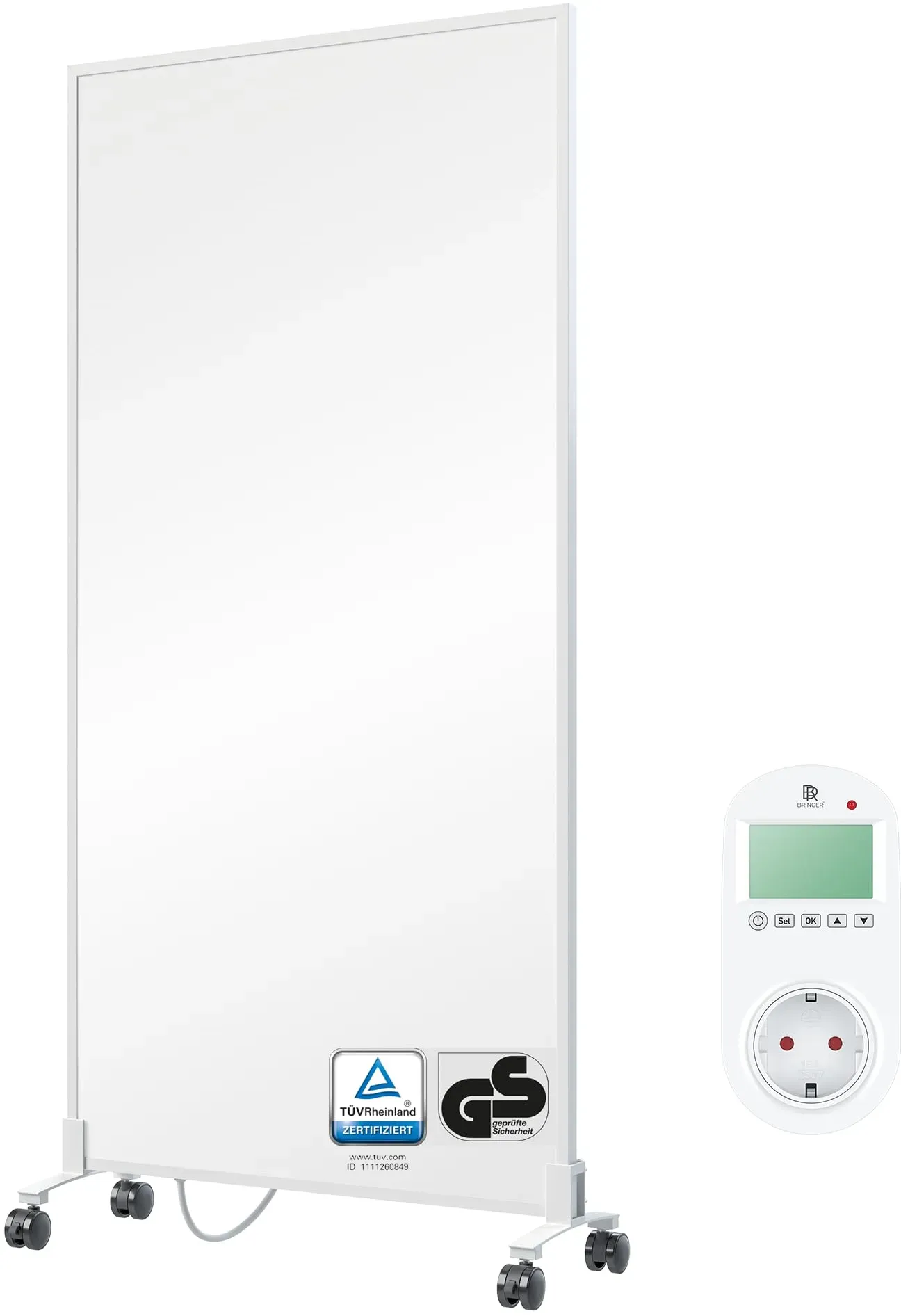 Zustand: Neu - Elektroheizkörper - BR Bringer - BRIH1000SF - EAN: 4260709689005 - Diese Infrarotheizung mit CarbonCrystal Heizelement sorgt für eine schnelle & gleichmäßige Wärmeverteilung im ganzen Raum, anders als herkömmlichen Heizungen. Gut für Asthmatiker und Rheumapatienten geeignet, da keine Staubwirbelung. Praktischer An/Aus-Schalter am Rahmen. Mithilfe der Standfüße können Sie Ihre Infrarotheizung auch bequem als Standheizung und mobile Infrarotheizung nutzen. Die Standfüße werden ganz einfach mit Schraube von hinten befestigt. Die Infrarot Heizung verfügt über einen praktischen Ein-/Ausschalt-Knopf am Rahmen. Praktisch zum umstellen wenn Sie Ihre Infrarotheizung als mobiles Standgerät flexibel nutzen möchten. Die Rollen lassen sich auch einklemmen, damit die Heizung nicht wegrollen kann. Rollen mit Antirutsch-Gummi-Beschichtung sorgen für mehr Standfestigkeit und vermeiden Kratzer auf dem Boden. Eine Infrarot Heizung ist deutlich effizienter und umweltfreundlicher als ein normaler Heizkörper. Unsere Elektroheizung verfügt über einen Überhitzungsschutz und ist für jeden Raum geeignet. Planen Sie bitte bei der Leistung mit 100-120 Watt/qm - Verkäufer: Kaeltebringer im amazon.de Marketplace ![]() ![]() BR Bringer Infrarotheizung Standgerät - 1000 Watt - Energiesparend - Mobile Elektroheizung mit Standfüßen auf Rollen, Steck-Thermostat - 5 Jahre Garantie, TüV - Deutsche Qualitätsmarke (weiß)