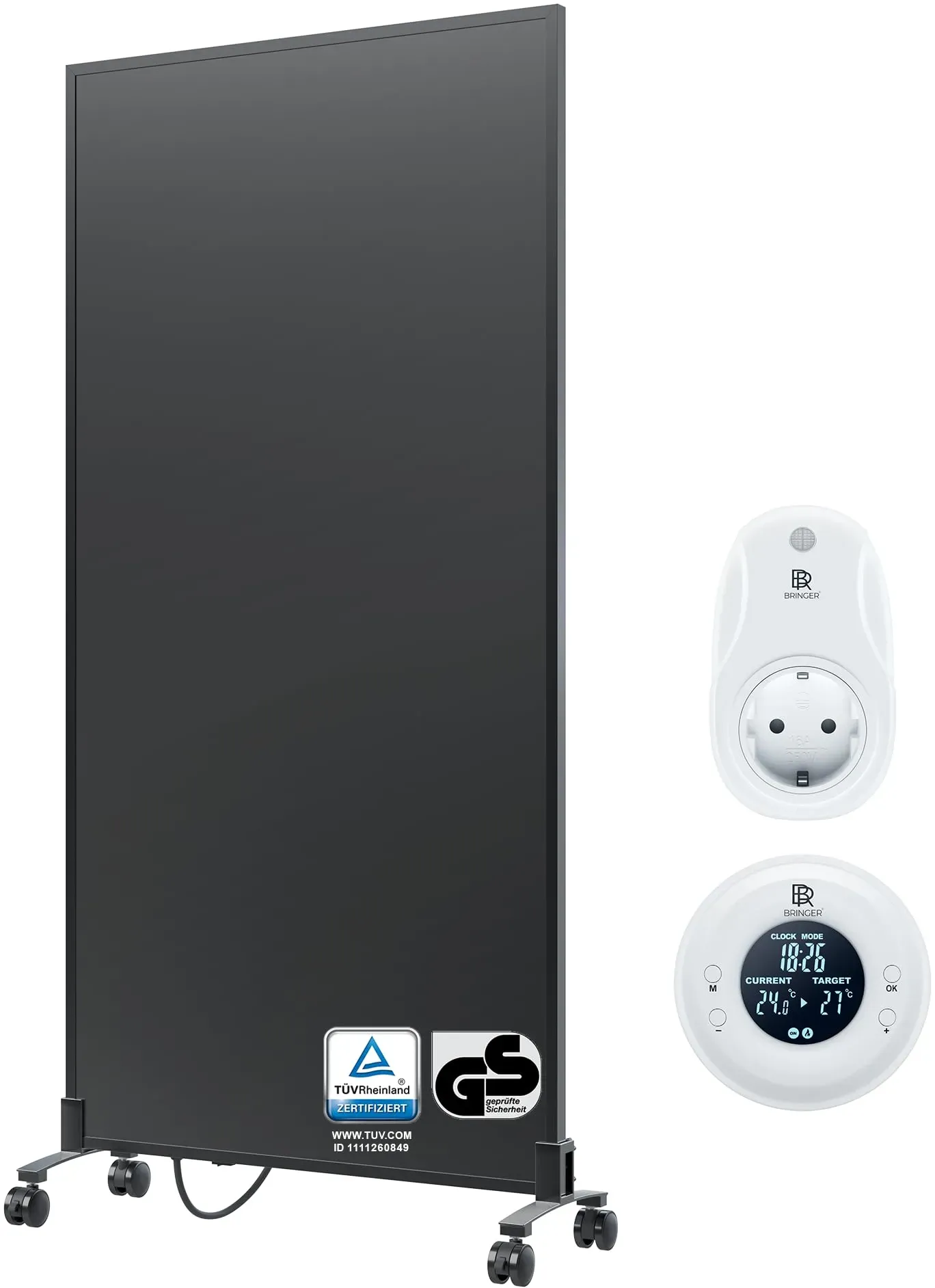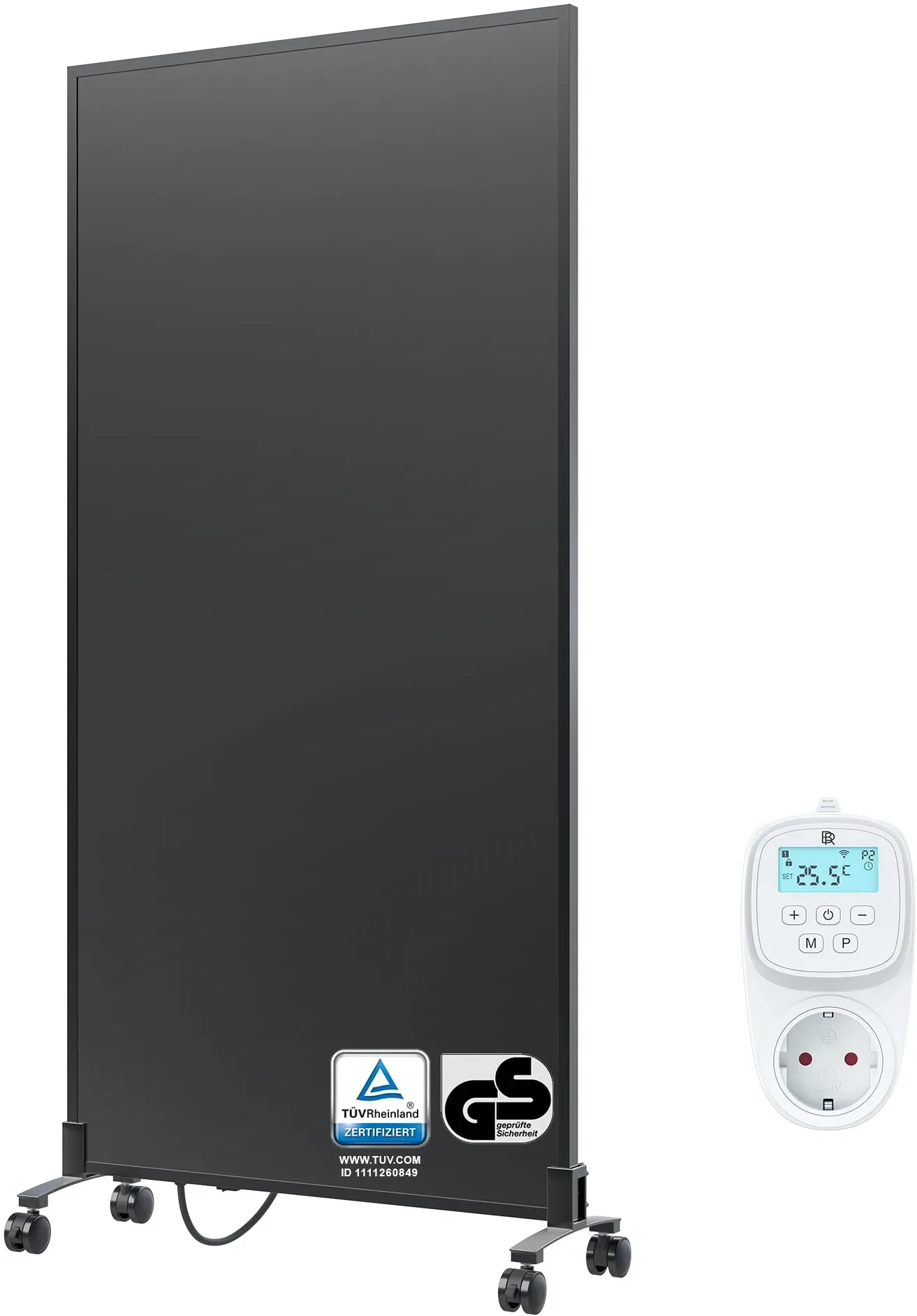 Zustand: Neu - Elektroheizkörper - BR Bringer SC Trade und Services GmbH - BRIH1000SFTT - EAN: 4260709686868 - Diese Infrarotheizung mit CarbonCrystal Heizelement sorgt für eine schnelle & gleichmäßige Wärmeverteilung im ganzen Raum, anders als herkömmlichen Heizungen. Gut für Asthmatiker und Rheumapatienten geeignet, da keine Staubwirbelung. Praktischer An/Aus-Schalter am Rahmen. Mithilfe der Standfüße können Sie Ihre Infrarotheizung auch bequem als Standheizung und mobile Infrarotheizung nutzen. Die Standfüße werden ganz einfach mit Schraube von hinten befestigt. Die Infrarot Heizung verfügt über einen praktischen Ein-/Ausschalt-Knopf am Rahmen. Praktisch zum umstellen wenn Sie Ihre Infrarotheizung als mobiles Standgerät flexibel nutzen möchten. Die Rollen lassen sich auch einklemmen, damit die Heizung nicht wegrollen kann. Rollen mit Antirutsch-Gummi-Beschichtung sorgen für mehr Standfestigkeit und vermeiden Kratzer auf dem Boden. Eine Infrarot Heizung ist deutlich effizienter und umweltfreundlicher als ein normaler Heizkörper. Unsere Elektroheizung verfügt über einen Überhitzungsschutz und ist für jeden Raum geeignet. Planen Sie bitte bei der Leistung mit 100-120 Watt/m² - Verkäufer: Kaeltebringer im amazon.de Marketplace ![]() ![]() BR Bringer Infrarotheizung Standgerät - 1000 Watt - Energiesparend - Mobile Elektroheizung mit Standfüßen auf Rollen, Thermostat und Fernbedienung - 5 Jahre Garantie, TüV (schwarz)