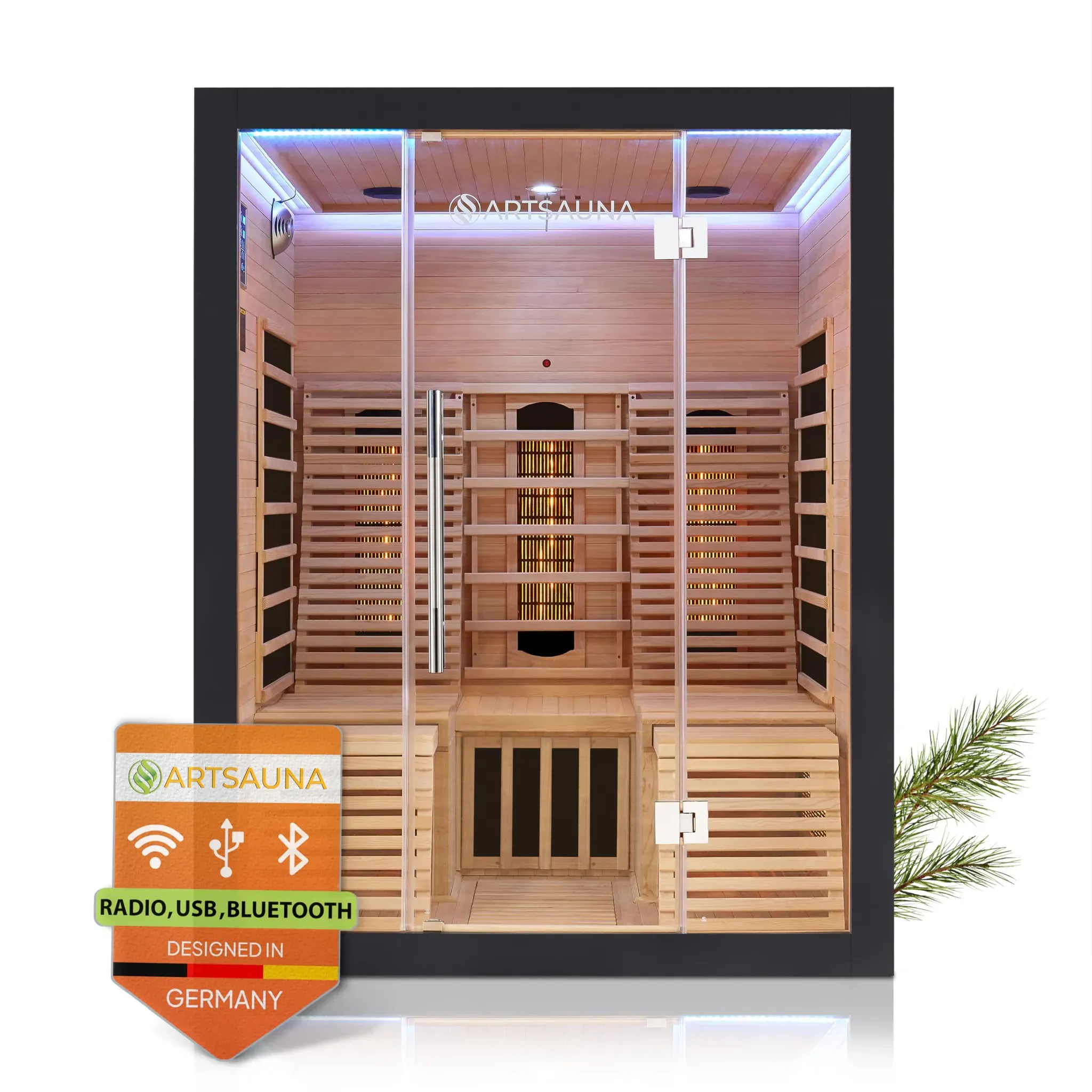 Zustand: Neu - Saunen - Artsauna Juskys Gruppe GmbH - 30612 - EAN: 4260565528944 - œ Wellness für Zuhause: Infrarotkabine 150x150x190 cm mit 2 Liegen und 1 Bank; 4 Flächen-, 5 Vollspektrumstrahler für gezielte Bestrahlung und wohltuende Wärme; positive Wirkung bei Verspannungen œ Hochwertiges Material: Infrarotsauna aus beständigem Hemlocktannenholz; hervorragende Wärmedämmkapazitäten & natürliche Unempfindlichkeit gegen Feuchtigkeit; schafft angenehmes Klima in der Kabine œ Stimmungsvolles Ambiente: Wärmekabine mit indirektem LED-Farblicht für perfekte Wohlfühl-Atmosphäre; eingebauter Ionisator für saubere Luft; effektiv gegen Gerüche, Schimmel & Keime œ Modernes Hi-Fi-System: Infrarotkabine mit Radio, Bluetooth & USB-Anschluss; einfache Bedienung dank Soft-Touch-Bedienpanel & Timerfunktion; bequem zurücklehnen & Wärmebad genießen œ Schneller Zusammenbau: IR-Kabine aus fertigen Grundelementen; Zusammenbau dank bewährtem Klicksystem in 30 - 60 Minuten; kein Starkstromanschluss benötigt; einfache 230 Volt Steckdose genügt - Verkäufer: Juskys im amazon.de Marketplace ![]() ![]() Artsauna Infrarotkabine Helsinki 150 Dual Technologie, LED - Infrarotsauna 150x150 cm - 1 Bank, 2 Liegen für 3 Personen - Wärmekabine Schwarz Black