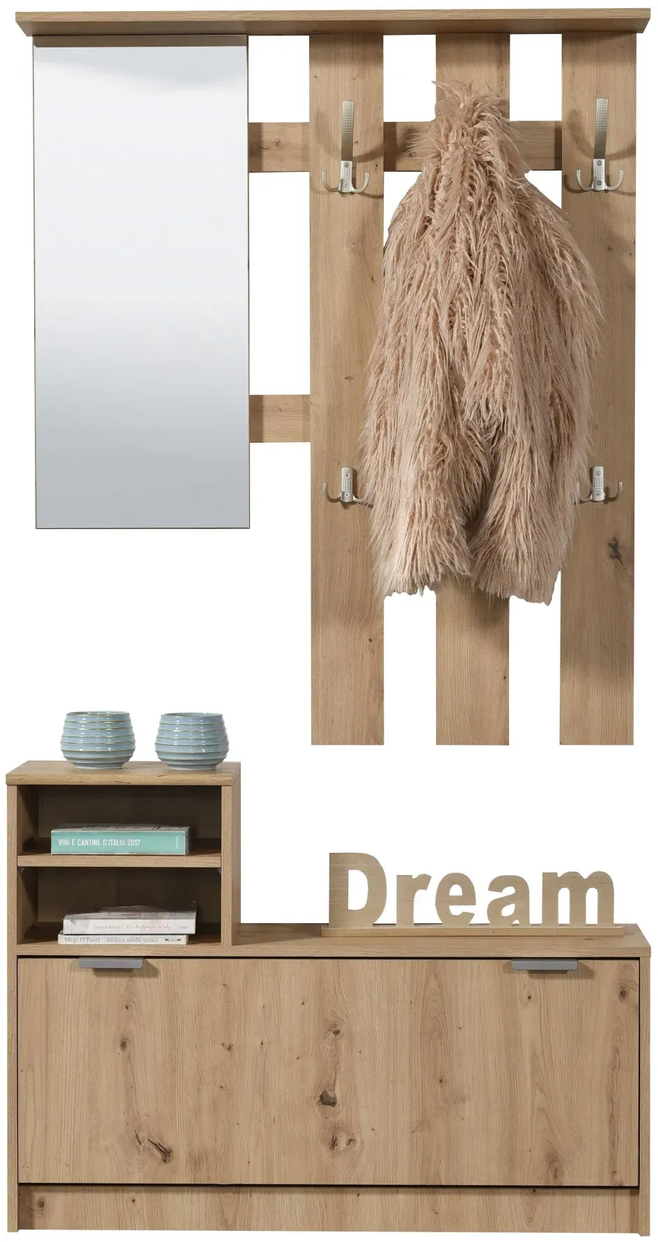 Kategorie: Garderoben - INOSIGN - GTIN:4046884020990 - Praktischer Begleiter für Ihren Ankleidebereich Optimale Platz- und Funktionsmöglichkeiten Material des Gestells: stabile Metallrohre Material der Sitzfläche: MDF, weiß beschichtet. Sitzhöhe ca. 48 cm Maße ca.: B. 53 x T. 47 x H. 118 cm - 34,99 Euro bei Amazon Marketplace Home - gefunden von billiger.de Ein kompaktes Garderoben-Set, das einen Schuhschrank und ein Garderobenpaneel mit Klapptür, Spiegel und Haken kombiniert und somit eine praktische Komplettlösung darstellt. ![]() ![]() Garderoben-Set INOSIGN "Ravenna Flurgarderobe, Dielenschrank, Kompaktgarderobe, Breite 100 cm", braun (artisan eiche), B:100cm H:191,5cm T:29cm, Glas, Kunststoff, Metall, Spanplatte, Kastenmöbel-Sets, inkl. Schuhschrank und Garderobenpaneel, mit Klapptür, Spiegel, Haken