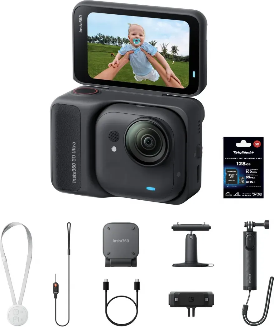3 Händlerangebote bei billiger.de - Kategorie: Action Cams - INSTA360 - Insta360 GO Ultra Creator Black, 4K Ultra HD, 240 fps, WLAN, Bluetooth, 500 mAh, 52,9 g Insta360 GO Ultra Creator Black. HD-Typ: 4K Ultra HD, Maximale Video-Auflösung: 3840 x 2880 Pixel, Maximale Framerate: 240 fps. Größe des Bildsensors: 25,4 / 1,28 mm (1 / 1.28'), Maximale Bildauflösung: 8192 x 6144 Pixel, Unterstützte Bildformate: DNG, JPG. Bildschirmdiagonale: 6,35 cm (2.5'). Blickwinkel (FOV): 156 , Feste Brennweite: 14,3 mm. ISO-Empfindlichkeit: 100, 6400, Belichtungskorrektur: 4EV - GTIN:6977644765241 Dieses Creator Bundle mit 128GB Voigtländer Speicherkarte bietet eine erweiterte Speicherkapazität für anspruchsvolle Nutzer. ![]() ![]() INSTA360 GO Ultra Creator Bundle Midnight Black + Voigtländer 128GB