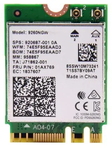 Intel - EAN: 0675901482943 - Die Intel Wireless-AC 9260 ist eine leistungsstarke Netzwerkkarte, die für die Integration in PCs und Notebooks konzipiert wurde. Sie unterstützt die kabellose übertragungstechnik und bietet eine maximale Datenübertragungsrate von bis zu 1730 Mbit/s. Mit dem Dual-Band WLAN (2,4 GHz und 5 GHz) ermöglicht sie eine flexible und schnelle Verbindung, die sich ideal für verschiedene Anwendungen eignet. Die Karte nutzt den Wi-Fi 5 Standard (802.11ac) und ist mit der M.2 Schnittstelle ausgestattet, was eine einfache Installation und Integration in moderne Systeme gewährleistet. Darüber hinaus unterstützt die Wireless-AC 9260 auch Bluetooth 5, was die Konnektivität mit einer Vielzahl von Geräten erweitert. Die kompakte Bauweise und das geringe Gewicht von nur 2,9 g machen sie zu einer praktischen Wahl für Nutzer, die Wert auf Leistung und Effizienz legen. - Maximale Datenübertragungsrate von 1730 Mbit/s - Dual-Band WLAN für flexible Verbindungen - Unterstützt Wi-Fi 5 (802.11ac) Standard - Integrierte Bluetooth 5 Unterstützung - Kompatibel mit Windows 10 und Linux. - bei galaxus.de - aus Yadore Produktdaten Ein sehr günstiges Angebot, das auch Bluetooth 5.0 beinhaltet. ![]() ![]() Bluetooth Wlan - Intel Wireless-AC eBay 9260 9260NGW 01AX769 aus Clevo NB50TZ