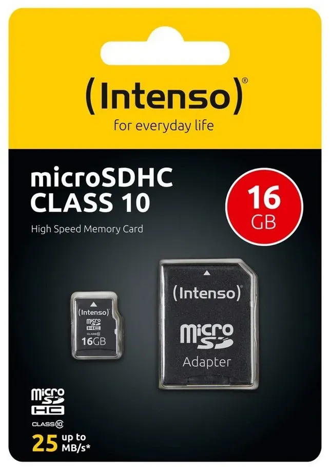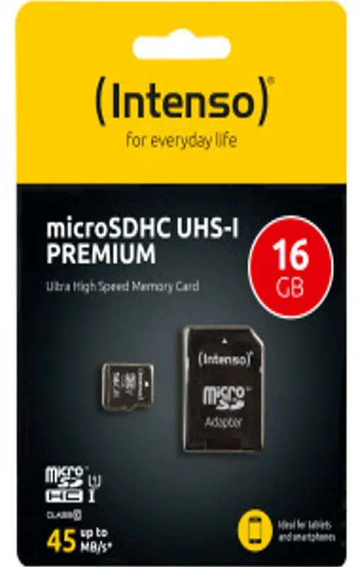 Speicherkarten - EAN:4034303019809 - Organisiert und sicher speichern: die Intenso Speicherkarte microSDHC-Card PREMIUM 16 GBDie Intenso Speicherkarte microSDHC-Card PREMIUM 16 GB bietet die Flexibilität, die Sie benötigen, um Ihre Daten effizient zu organisieren und dauerhaft zugänglich zu machen. Karten vom Typ microSD sind durch ihre geringe Größe ideal für den mobilen Einsatz und bieten ein weites Feld an Anwendungsmöglichkeiten.Informationen zur LesegeschwindigkeitDurch den Geschwindigkeitsstandard UHS-I und die Geschwindigkeitsklasse Class 10 profitieren Nutzer von einer ultraschnellen und effizienten Datenverarbeitung, die speziell auf anspruchsvolle Aufgaben ausgelegt ist. Mit einer Lesegeschwindigkeit von 90 MB/Sek. arbeitet das Modell äußerst schnell. Der mitgelieferte SD-Adapter erlaubt die Verwendung der Karte auch in Geräten, für die an sich nur größere SD-Karten geeignet sind.Was bedeutet 16 GB Speicherkapazität konkret?Dank einer Speicherkapazität von 16 GB können Sie z.B. 10.000 Word-Dokumente (1-2 MB pro Datei), ca. 6.000 Fotos in Standardqualität, 4.000 Songs im MP3-Format oder etwa 4 Stunden Videomaterial in Full-HD-Qualität sichern.Setzen Sie auf zuverlässigen Speicherplatz für unterwegsUm Ihnen den Start mit der Intenso Speicherkarte microSDHC-Card PREMIUM 16 GB ganz einfach zu machen, erhalten Sie die Lieferung inklusive SD-Adapter. - gefunden von Kelkoo Bietet eine Class 10 UHS-1 Karte zu einem sehr guten Preis, ideal für alltägliche Anwendungen. Reichelt.d e INTENSO 3423470 - MicroSDHC-Speicherkarte 16GB, Intenso Class 10, UHS-1
