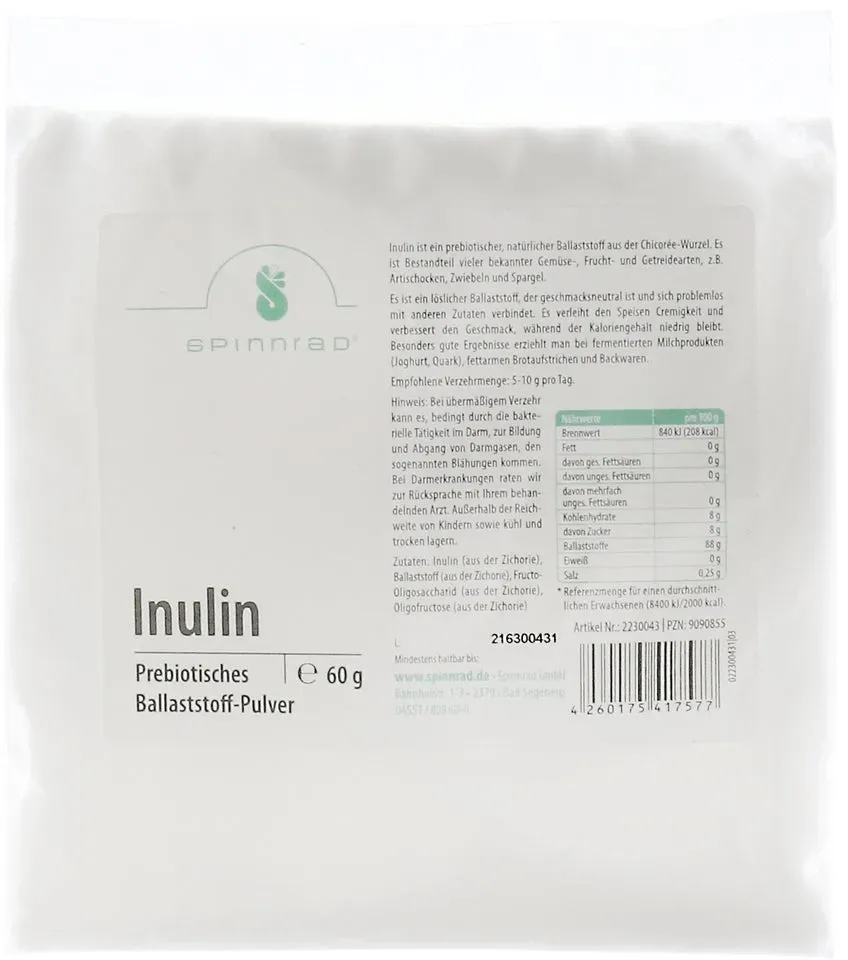 17 Händlerangebote bei billiger.de - Kategorie: Arzneimittel - SPINNRAD GMBH - Inulin ist ein prebiotischer, natürlicher Ballststoff aus der Chicor e-Wurzel. Es ist Bestandteil vieler bekannter Gemüse-, Frucht- und Getreidearten, z.B. Artikschocken, Zwiebeln und Spargel. Es ist ein löslicher Ballaststoff, der einen aktivierenden Einfluss auf die Darmflora ausübt. Inulin ist geschmacksneutral und verbindet sich problemlos mit anderen Zutaten. Es verleiht den Speisen Cremigkeit und verbessert den Geschmack, während der Kaloriengehalt niedrig bleibt. Besonders gute Ergebnisse erzielt man bei fermentierten Milchprodukten (Joghurt, Quark), fettarmen Brotaufstrichen und Backwaren (10 % des Mehls ist zu ersetzen). Bei übermäßigem Verzehr kann es bedingt durch die bakterielle Tätigkeit im Darm, zur Bildung und Abgang von Darmgasen, den sogenannten Blähungen kommen. Bei Darmerkrankungen raten wir, vor dem Verzehr, zur vorsorglichen Konsultation Ihres behandelnden Arztes. - GTIN:4260175417577 - PZN:09090855 Dieses Angebot ist mit 3.83 Euro für 60g Inulin Pulver eine sehr preiswerte Option, um Inulin auszuprobieren. ![]() Medikament e- per- klick.de Für 8.33 Euro erhalten Sie 180g Bio Inulin Pulver, was eine gute Option für umweltbewusste Käufer ist. ![]() Medikament e- per- klick.de INULIN 100% Bio Pulver 180 g