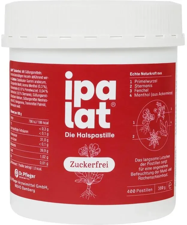0,09 /Stück - Kategorie: Arzneimittel - Dr. Pfleger Arzneimittel - GTIN:4028305001542 - PZN:16395851 - Bitte achten Sie auf eine abwechslungsreiche und ausgewogene Ernährung und gesunde Lebensweise.ipalat ZuckerfreiEchte Naturkraft mit Primelwurzel. ipalat Zuckerfrei verbindet die wohltuende echte Naturkraft der Primelwurzel mit dem angenehmen Geschmack aus der einzigartigen Zubereitung mit Anis und Fenchel. Beim Lutschen der Pastille bildet sich ein wohltuender Film im Rachen. ipalat Zuckerfrei ist Balsam für den Hals.Bewährt bei Reizungen von Stimme, Hals Rachen Die ipalat Zuckerfrei Halspastille ist bewährt bei rauem Hals und Halskratzen, strapazierter Stimme sowie bei Heiserkeit und Hustenreiz. Das enthaltene Menthol sorgt für frisches und befreites Atmen.ipalat Zuckerfrei bei rauem Hals und Halskratzen bei strapazierter Stimme bei Heiserkeit und Hustenreiz bei trockenem Mund nach Nikotin- und Alkoholkonsum für die Stimmpflege für freies Durchatmen bei schlechtem Atemipalat Zuckerfrei auf einen Blick: mit Menthol, ohne Zucker mit pflanzlichen Extrakten aus Primelwurzel, Anis und Fenchel bewährt bei Heiserkeit, Hustenreiz und Mundtrockenheit für frischen Atem sanft gut verträglich die zahnfreundliche ipalat -VarianteZutaten:Stabilisator Gummi arabicum, Süßungsmittel Maltit, Aroma Menthol (0,3%), Kräuterextrakte (0,24 %; Primelwurzel, Fenchel, Sternanis), Süßungsmittel Saccharin-Natrium, Süßungsmittel Neohesperidin DC, Honigaroma.Nährwerte: Durchscnittliche Nährwerte: ... Mit 10,44 Euro für 120 Stück ist dies ein sehr gutes Preis-Leistungs-Verhältnis für eine größere Packung. ![]() ![]() Dr. Pfleger Arzneimittel ipalat Die Halspastille Zuckerfrei 120 St