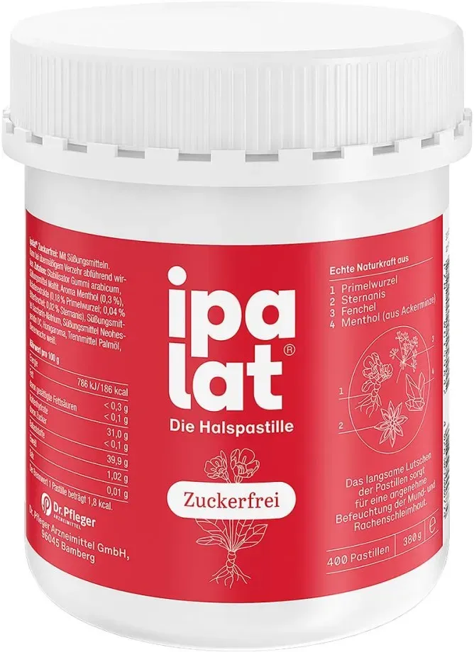 EAN: 4028305000705 - ipalat Zuckerfrei Echte Naturkraft mit Primelwurzel ipalat Zuckerfrei verbindet die wohltuende echte Naturkraft der Primelwurzel mit dem angenehmen Geschmack aus der einzigartigen Zubereitung mit Anis und Fenchel. Beim Lutschen der Pastille bildet sich ein wohltuender Film im Rachen. ipalat Zuckerfrei ist Balsam für den Hals. Bewährt bei Reizungen von Stimme, Hals & Rachen Die ipalat Zuckerfrei Halspastille ist bewährt bei rauem Hals und Halskratzen, strapazierter Stimme sowie bei Heiserkeit und Hustenreiz. Das enthaltene Menthol sorgt für frisches und befreites Atmen. ipalat Zuckerfrei bei rauem Hals und Halskratzen bei strapazierter Stimme bei Heiserkeit und Hustenreiz bei trockenem Mund nach Nikotin- und Alkoholkonsum für die Stimmpflege für freies Durchatmen bei schlechtem Atem ipalat Zuckerfrei auf einen Blick: mit Menthol, ohne Zucker mit pflanzlichen Extrakten aus Primelwurzel, Anis und Fenchel bewährt bei Heiserkeit, Hustenreiz und Mundtrockenheit für frischen Atem sanft & gut verträglich die zahnfreundliche ipalat -Variante Häufige Fragen & Antworten Enthalten ipalat Zuckerfrei Halspastillen Laktose? ipalat Zuckerfrei Halspastillen sind laktosefrei und somit für Menschen mit einer Milchzucker-Unverträglichkeit geeignet. Enthalten ipalat Zuckerfrei Halspastillen Gluten? ipalat Zuckerfrei Halspastillen sind glutenfrei und somit für Menschen mit einer Gluten-Sensitivität oder Zöliakie geeignet. Sind ipalat Zuckerfrei Halspastillen für Allergiker ... Dieses Angebot für 5,28 Euro für 40 Stück ist eine gute Wahl für den regelmäßigen Gebrauch. ![]() ![]() Dr. Pfleger Arzneimittel Ipalat Halspastillen Zuckerfrei