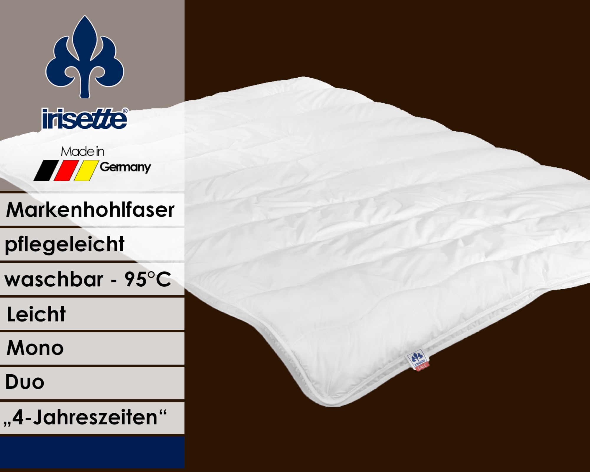 Zustand: Neu - Bettdecken - Irisette Badenia Bettcomfort GmbH & Co. KG - 03650110149 - EAN: 4006474358346 - PREMIUM PRODUKT VON IRISETTE - die Steppdecke mit spezieller Körperzonensteppung sorgt in Kombination mit den verwendeten hochwertigen Materialien für eine optimale Wärmeverteilung und einen schnellen Feuchtigkeitstransport ANGENEHMER BEZUG - 100 Prozent Polyester - Top Cool Funktionsgewebe mit geprägter Irisette Lilie KLIMAREGULIERENDE FÜLLUNG - 100 Prozent Polyester - Markenhohlfaser Irisette Fill mit besonders hoher Bauschkraft (Füllgewicht 400 gr. + 700 gr.) PFLEGEHINWEIS - Waschbar und kochfest bis 95 Grad; Bei niedriger Temperatur schonend trocknen; Getestet und zertifiziert nach den strengen Kritieren von Öko Tex 100. Bestens geeignet für Allergiker DEUTSCHES MARKENPRODUKT - Unsere Irisette Kollektion wird nach deutschem Qualitätsstandard produziert und ist zertifiziert nach Öko-Tex Standard 100; Die Lieferung erfolgt zudem mit einer praktischen Aufbewahrungstasche für eine hygienische Lagerung oder Aufbewahrung - Verkäufer: Amazon im amazon.de Marketplace ![]() ![]() Irisette 4-Jahreszeit - Steppbett Jette eBay 135x200 cm / 155x220 cm - 95C waschbar