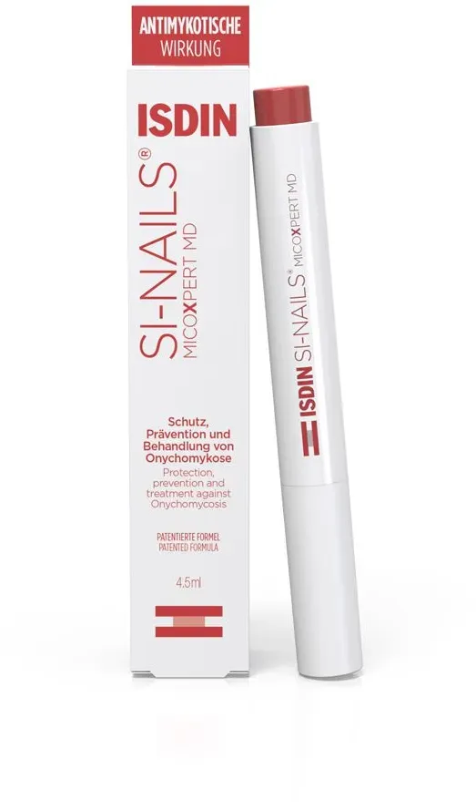 EAN: 4150185016429 - ISDIN SI-Nails MicoXpert wirksam bei leichten bis mittelschweren Nagelpilz-Infektionen verbessert die Nagelqualität und das Nagelwachstum hellt Verfärbungen auf remineralisiert die Nägel und spendet Feuchtigkeit einfache Anwendung praktisches Stift-Format kein Feilen notwendig Schutz und Pflege für gesunde Nägel - Für die Behandlung und Vorbeugung von Nagelpilz Nagelpilz ist eine weit verbreitete Infektion, die oft mit unangenehmen Symptomen wie gelben Verfärbungen, Brüchigkeit und Verdickung der Nägel einhergeht. SI-Nails MicoXpert hilft, Nagelpilz zu bekämpfen und schützt vor einer erneuten Infektion. Gleichzeitig sorgt dafür, dass Ihre Nägel gesünder und gepflegter aussehen. Das Medizinprodukt enthält eine innovative Kombination von Inhaltsstoffen, die Pilze direkt an der Wurzel bekämpfen. Gleichzeitig bildet es einen unsichtbaren Schutzfilm auf den Nägeln, der verhindert, dass sich Pilze weiter ausbreiten. SI-Nails MicoXpert spendet außerdem Feuchtigkeit, stärkt die Nägel und fördert die Nagelqualität sowie das gesunde Wachstum. Die Vorteile auf einen Blick Verbessert das Aussehen der Nägel: Gelbe Verfärbungen und andere sichtbare Anzeichen von Nagelpilz werden reduziert. Schutz vor Pilzen: Bildet eine Barriere, die das Wachstum von Pilzen verhindert. Feuchtigkeit für Nägel und Nagelhaut: Trockene, brüchige Nägel werden wieder geschmeidig und stärker. Einfache Anwendung: Kein Feilen nötig - einfach auftragen und die Nägel werden gepflegt. Mit ... Ein preiswertes Angebot für den MICOXPERT MD Stift von einer bekannten Apotheke. ![]() ![]() Isdin Si-Nails Micoxpert MD Stift 4,5 ml Stifte