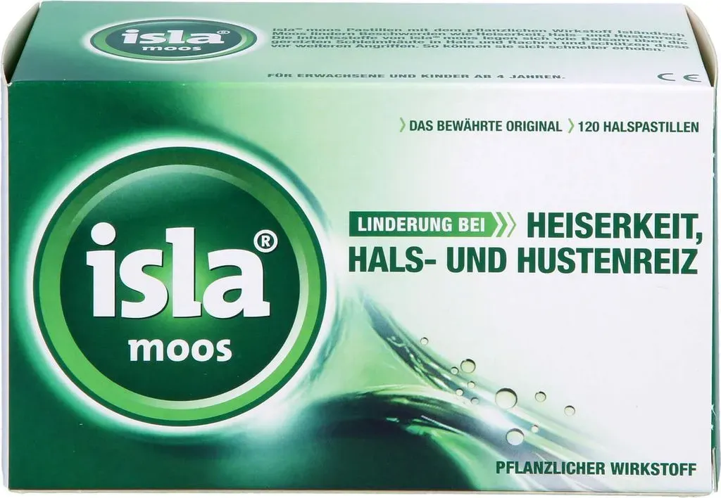 Zustand: Neu - 0,18 € / Stück - Erkältung & Grippe Medikamente bei Erkältung - ISLA Engelhard Arzneimittel, Deutschland - P7233888 - EAN: 4150072338887 - 🌿 Pflanzlicher Wirkstoff aus Isländisch Moos ðŸŒ¶ï¸ Mit natürlichem Ingwer für wohltuende Wärme 🯠Abgerundet mit feinem Honig ðŸ›¡ï¸ Schützt und befeuchtet Hals- und Rachenschleimhaut 🤧 Linderung bei Heiserkeit, Hals- und Hustenreiz - Verkäufer: apominga - Die Online Apotheke in München im amazon.de Marketplace ![]() claras- apotheke.d e isla moos Halspastillen bei Halskratzen und Reizhusten, 120 St