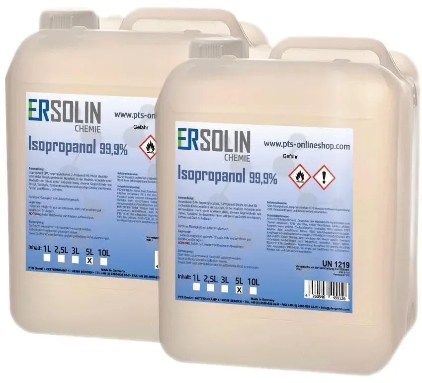 Kategorie: Reinigungsmittel - ERSOLIN - GTIN:4260546499492 - Entfernen von Kleberesten oder Fettrückständen Entfetter für Glasflächen Lösungsmittel für Harze, Fette, Lack, Tinte keine Zusätze von Farb- und Duftstoffen Isopropanol 99,9% - 34,48 Euro bei Amazon Marketplace Health & Personal Care - gefunden von billiger.de ERSOLIN bietet hier eine praktische Aufteilung in 2x5 Liter, was die Handhabung und Lagerung erleichtern kann. ![]() ![]() ERSOLIN Isopropanol 99,9% 2x5 Liter IPA Entfetter Reiniger erhältlich in 1L 2.5L 3L 10L