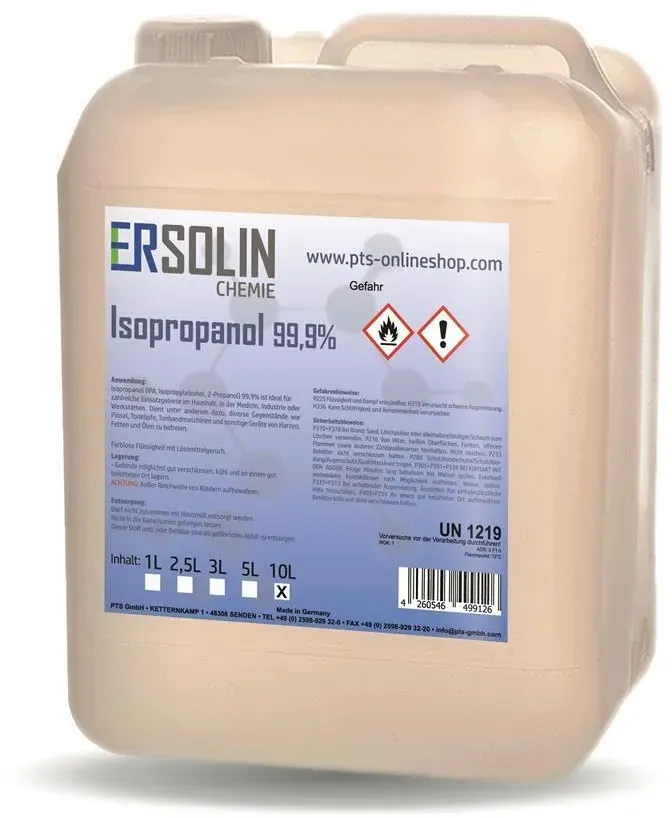 Kategorie: Reinigungsmittel - ERSOLIN - GTIN:4260546499508 - Entfernen von Kleberesten oder Fettrückständen Entfetter für Glasflächen Lösungsmittel für Harze, Fette, Lack, Tinte keine Zusätze von Farb- und Duftstoffen Isopropanol 99,9% - 35,98 Euro bei Amazon Marketplace Health & Personal Care - gefunden von billiger.de Höfer Chemie ist ein bekannter Anbieter und dieses Angebot für 10L Isopropanol 99,9% im Kanister ist eine solide Wahl für den regelmäßigen Gebrauch. ![]() ![]() Höfer Chemie 1x 10 L Isopropanol 99,9% in Kanister