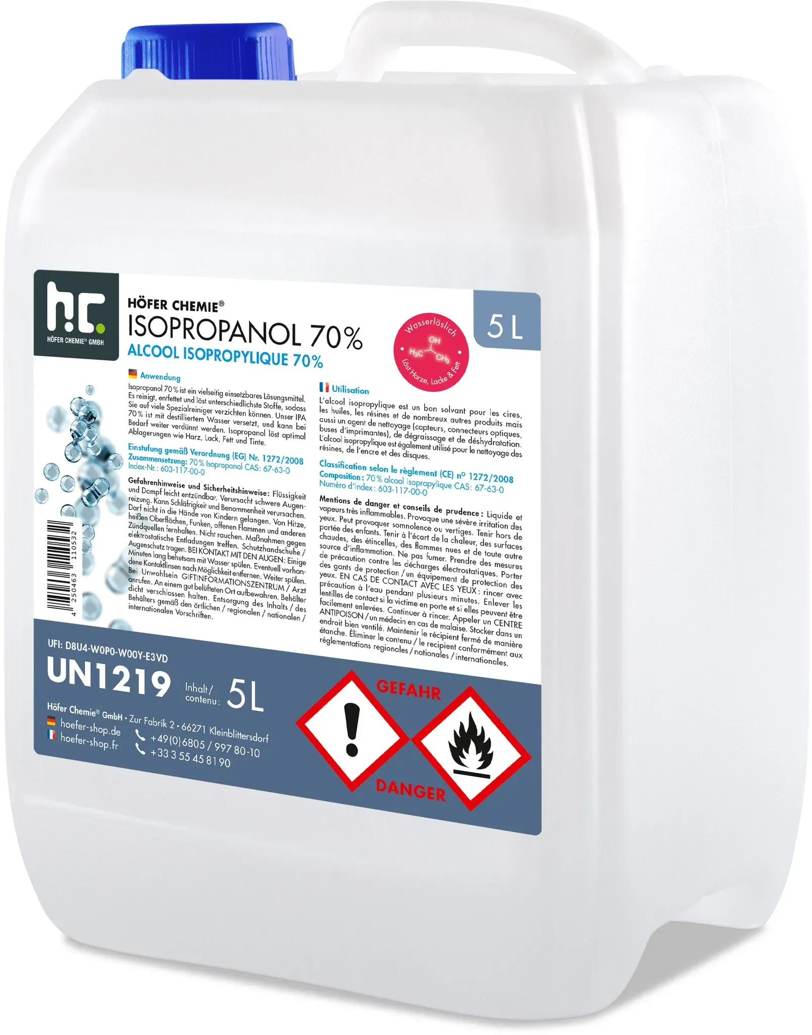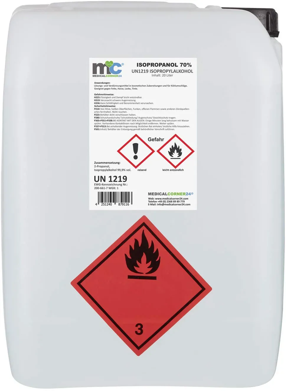 Kategorie: Sonstiges Autozubehör - Medicalcorner24 - GTIN:0704679372696 - Isopropylakohol 70 % zur Reinigung gut wasserlöslich rückstandsfrei 20 Liter Kanister - 97,99 Euro bei Amazon Marketplace Automotive - gefunden von billiger.de Dieses Großgebinde mit 48 x 5 Liter Kanistern ist für industrielle oder sehr große gewerbliche Anwendungen gedacht. ![]() ![]() Höfer Chemie 48x 5 L Isopropanol 70% in Kanistern
