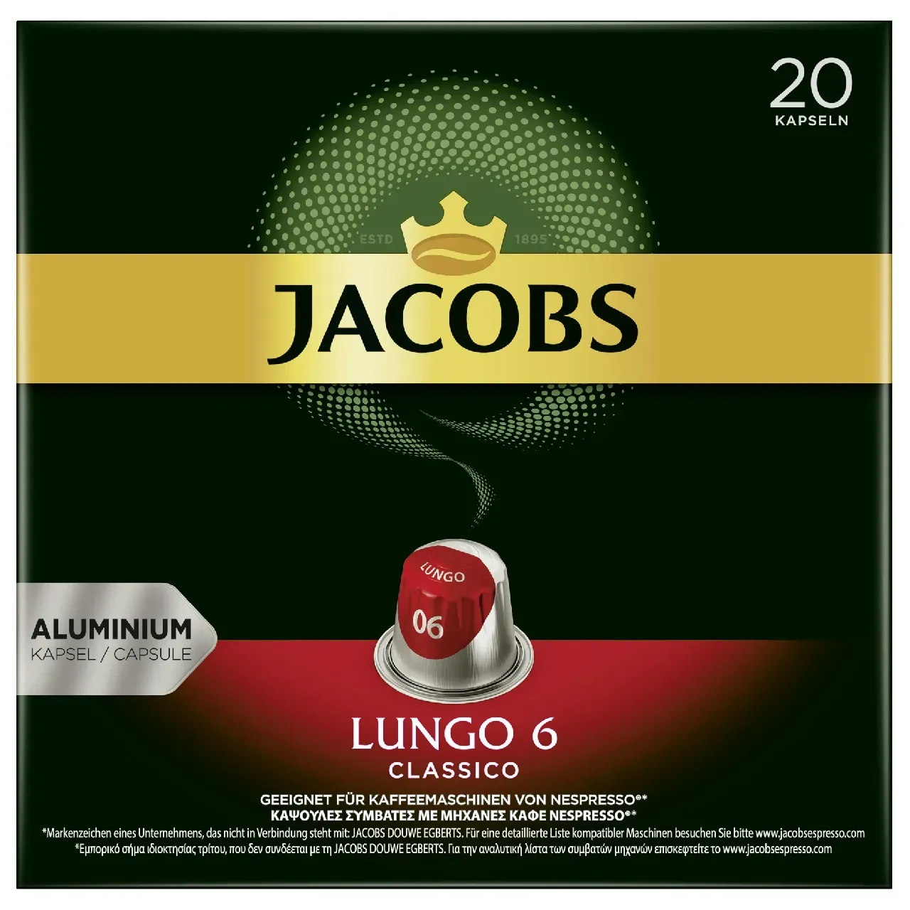 Jacobs - EAN: 8711000371220 - . Arabica- und Robusta-Bohnen . 100% UTZ-zertifizierter Kaffee . Dicke und feinporige Crema . Mildes, frisches und würziges Aroma . Intensität 6/12 . Ergibt 10 Tassen Lungo (110ml) Merkmale: geeignet für: Nespresso Kaffeeart: Kaffee weitere Produktinformationen: Inhalt: 52g, Zutaten: gemahlener Röstkaffee Aufbewahrungshinweise: Sauber, trocken und bei Raumtemperatur lagern. Lebensmittelunternehmer, in dessen Namen das Produkt vermarktet wird: JACOBS DOUWE EGBERTS DE GmbH, Langemarckstr. 4-20, 28199 Bremen - bei bueromarkt-ag.de - aus Yadore Produktdaten Dieses Angebot ist identisch mit dem vorherigen und bietet Jacobs Lungo 6 Classico Kaffeekapseln zu einem guten Preis. ![]() Jacobs Lungo 6 Classico Kaffeekapseln, Röstkaffee, 10 x 52 g, Nespresso®-kompatibel, UTZ-zertifiziert