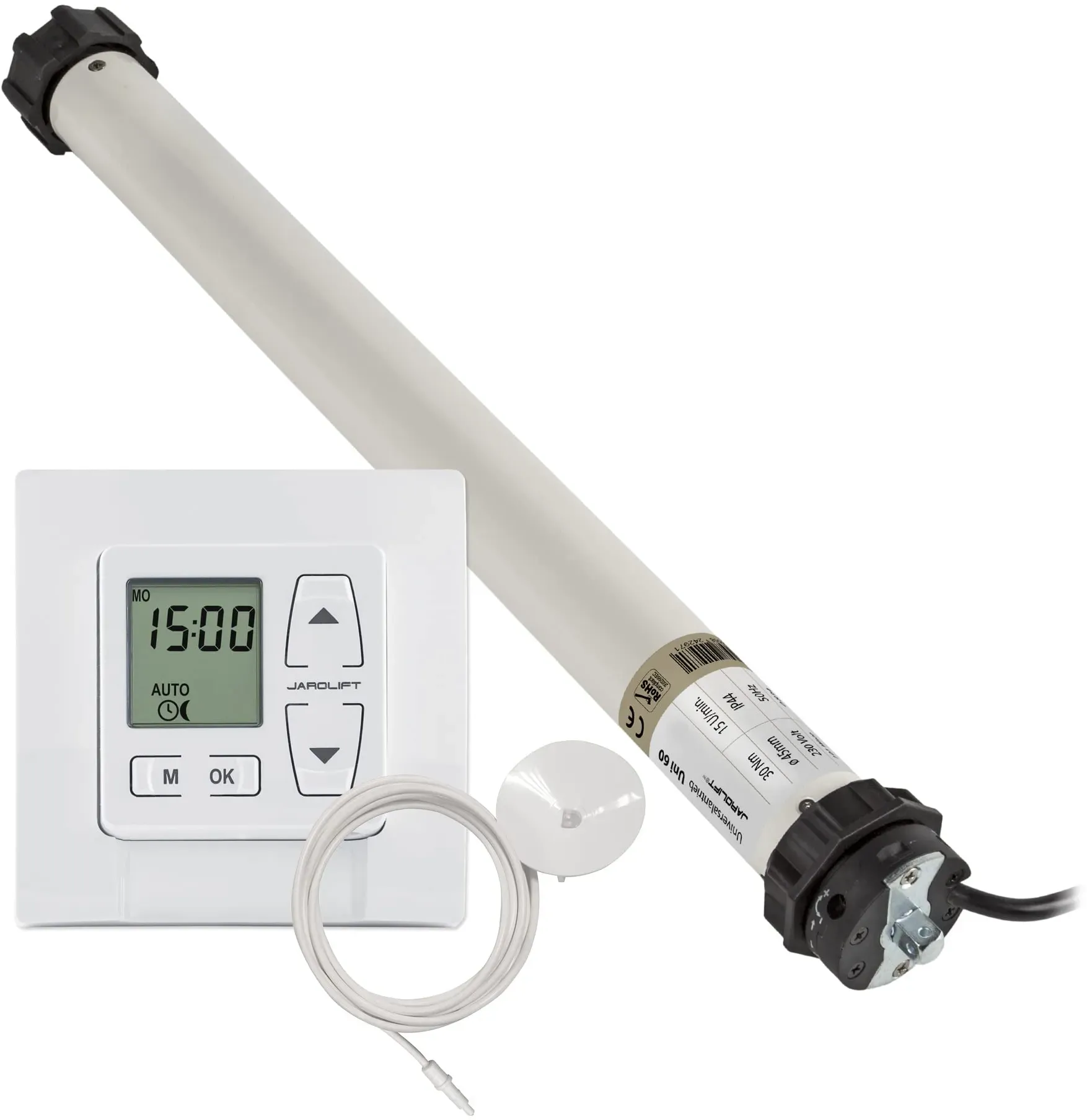 Zustand: Neu - Zeitschaltuhren - jarolift - - EAN: 4250558275788 - Hochwertiger elektromechanischer Rollladenmotor:Dieser leistungsstarke Rollladenmotor mit 13 Nm Drehmoment und 30 kg Zugkraft eignet sich für Rollläden mit SW40 Wellen Flüsterleiser Betrieb: Der Motor arbeitet geräuscharm und sorgt für eine ruhige Umgebung in Ihrem Zuhause. Komfort: Ein Knopfdruck genügt, um den Rollladen aus- oder einzuziehen. Das spart Zeit und die mühsame Bedienung per Hand entfällt komplett. Nachrüstung mit Funk möglich. Überlastungsschutz mit thermischer Absicherung: Der Motor verfügt über einen integrierten Überlastungsschutz und thermische Absicherung, um Langlebigkeit und Sicherheit zu gewährleisten. Vielseitig einsetzbar: Dieser Motor kann sowohl drinnen für Rollläden und vertikale Vorhänge als auch draußen (Schutzklasse IP44) für Rollläden und Rolltore verwendet werden. Zusätzlich ermöglicht ein optionaler Aktor die bequeme Steuerung via App über Ihr Mobiltelefon. - Verkäufer: Jalousiescout Shop im amazon.de Marketplace ![]() ![]() jarolift Elektromechanischer Universalmotor Uni 60 Rohrmotor SW60 + THOR Zeitschaltuhr inkl. Sonnensensor