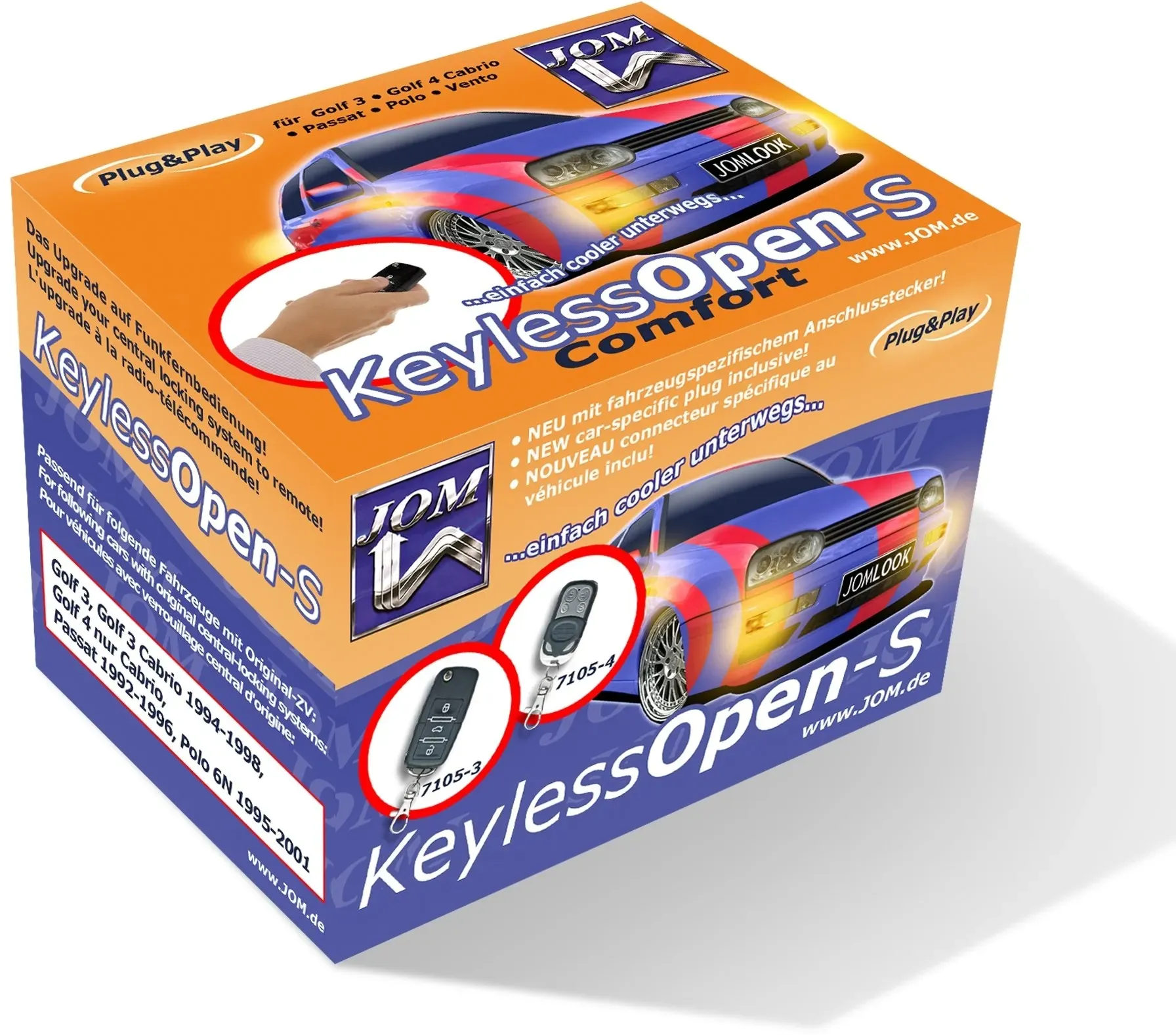 JOM - EAN: 4048961082341 - Produktreihe: KeylessOpen-S; Spannung [V]: 12; Stromaufnahme [mA]: 15; Schließanlage: mit Fernbedienung; Anzeige: mit LED-Anzeige; Relaisfunktion: Zentralverriegelung, Blitz-Kennleuchte, Zentralelektrik, Wegfahrsperre, Alarmanlage; Ergänzungsartikel... - bei autodoc.de - aus Yadore Produktdaten Dieses Angebot ist empfehlenswert, da es eine Plug&Play Funkfernbedienung für spezifische VW-Modelle zu einem höheren Preis, aber mit einfacher Installation, bietet. ![]() ![]() JOM 7105-1 - Plug&Play Funkfernbedienung eBay für VW Golf 3,4(Cabrio),Passat35i,Polo 6N