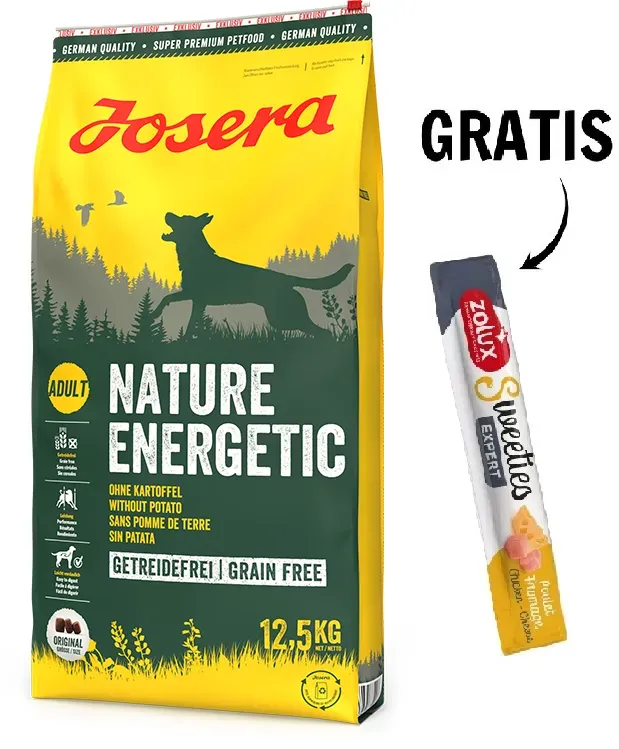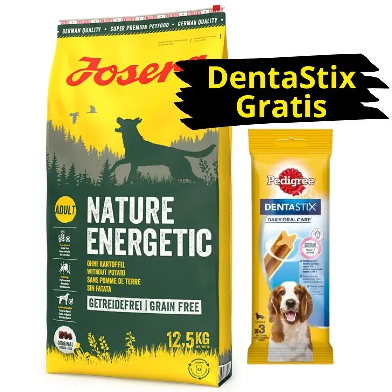 3,56 /kg - Kategorie: Hundefutter - Josera - GTIN:4032254775423 - Alleinfuttermittel für ausgewachsene Hunde. - 44,53 Euro bei Zooland - gefunden von billiger.de Dieses Angebot ist besonders empfehlenswert, da es gratis PEDIGREE DentaStix enthält. ![]() ![]() JOSERA Nature Energetic - Grain Free 12,5kg + PEDIGREE DentaStix GRATIS!