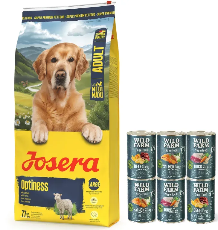 Verfügbarkeit: Auf Lager - Kategorie: Hundefutter - Josera - GTIN:4032254786429 - REDUZIERTER EIWEISSGEHALT €“ ideal für ausgewachsene, mittlere und große Hunde größerer Rassen zur Entlastung der Organe REZEPTUR MIT LAMM & OHNE MAIS €“ extra große, schmackhafte XL-Kroketten gegen Schlingen mit feinem Lammfleisch ( 77 % tierisches Protein am Gesamtprotein ) und ohne die Zugabe von Mais, damit gut verträglich MIT WERTVOLLEN FETTSäUREN €“ sorgen für gesunde Haut und schönes, glänzendes Fell, L-Carnitin & Taurin sind zudem enthalten für die Herzfunktion KONTROLLIERTE & HOCHWERTIGE ZUTATEN €“ ohne den Zusatz von Weizen, Soja und Zucker sowie künstlichen Farb- und Aromastoffen GERMAN QUALITY & OHNE TIERVERSUCHE €“ Herstellung durch ein mittelständisches deutsches Familienunternehmen mit eigenem Lebensmittellabor - 40,75 Euro bei Amazon Marketplace Lawn & Garden - gefunden von billiger.de Dieses Paket enthält zusätzlich Wild Farm Superfood MIX, was eine gute Ergänzung zur normalen Nahrung darstellt. ![]() ![]() JOSERA Adult Optiness 12.5kg + Wild Farm Superfood MIX 6x400g
