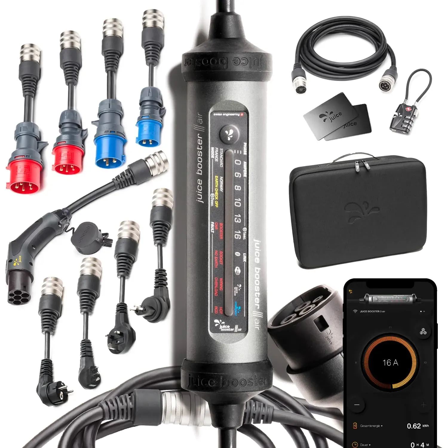 Kategorie: Ladekabel für Elektrofahrzeuge - Juice - GTIN:4313042877513 - * Bis zu 11 kW Ladeleistung (5x schneller laden) * Konfigurierbare Ladeleistung * Integrierter Energiezähler (ungeeicht) * Zugangskontrolle über RFID-Karten * Kommunikation über WLAN oder Bluetooth * Integrierter Fehlerstromschutz (AC, DC + 6mA) * Statusanzeige über LED und in der App - 1109,00 Euro bei The Mobility House - gefunden von billiger.de Eine mobile Wallbox mit App, Stromzähler und RFID-Freischaltung, die ein hohes Maß an Komfort und Sicherheit bietet. ![]() ![]() Juice Booster 3 air - Mobile Wallbox & Typ 2 Ladekabel 11 kW, mit App & Stromzähler, RFID-Freischaltung, wasserdicht & überfahrsicher - Made in Germany