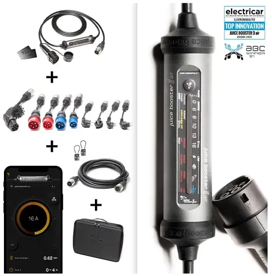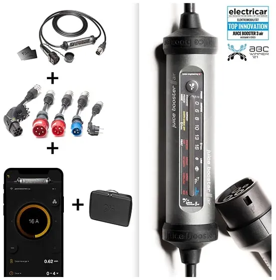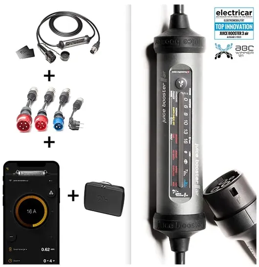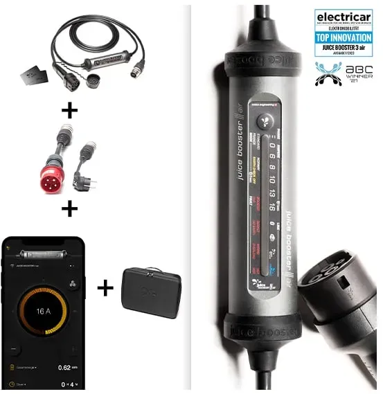 Kategorie: Ladekabel für Elektrofahrzeuge - Juice - GTIN:4313042877551 - Wallbox & mobile Ladestation JUICE BOOSTER 3 air | EU Traveller SetDie smarte 7-in-1-Ladelösung für Elektrofahrzeuge für zuhause oder unterwegsFreischaltung per RFIDvollautomatische AdaptererkennungIntegriertes dynamisches Lastmanagement für bis zu zehn Geräteüberwachung der Ladevorgänge, Fern- und Zeitsteuerung mit der App j+ pilot Integrierter FI-Schutz gegen Gleich- und Wechselstromfehlerströme, detaillierte Fehlererkennung, und auch Detektion von falsch verdrahteten Steckdosen und übermässiger StromaufnahmeSehr robuste Bauweise: überfahrsicher, staub- & wasserdicht und temperaturbeständigSet inkl. 4 Adapter: CEE32 400 V, CEE16 400 V, CEE32 230 V, Schuko 7/7 230 V (insgesamt über 30 Adapter erhältlich)Der JUICE BOOSTER 3 air ist eine vielseitige Ladelösung für Elektrofahrzeuge mit Typ-2-Ladeanschluss. Dank App-Anbindung, Freischaltung per RFID, integriertem Lastmanagement und Logbuch inkl. Belegfunktion ist der JUICE BOOSTER 3 air nicht nur ausgesprochen multifunktional und flexibel, sondern auch intelligent. Mit einer Ausgangsleistung von bis zu 11 kW lädt das E-Fahrzeug immer maximal sicher, schnellstmöglich und völlig unkompliziert an praktisch jeder herkömmlichen Haushalts- oder Industriesteckdose weltweit. Dank speziell entwickelter Anschlussadapter und der umfangreichen Sicherheitsausstattung ist eine Fehlbedienung ausgeschlossen.Intelligente Technologie vereint mit gewohnter RobustheitDer ... Diese mobile Wallbox bietet 11 kW Ladeleistung, App-Steuerung und ist "Made in Germany", was für Qualität spricht. ![]() ![]() Juice Booster 3 air - Mobile Wallbox 11 kW mit App, ohne Installation, Stromzähler & RFID-Zugang, Temperaturüberwachung im Stecker, Typ 2 Ladekabel - Made in Germany