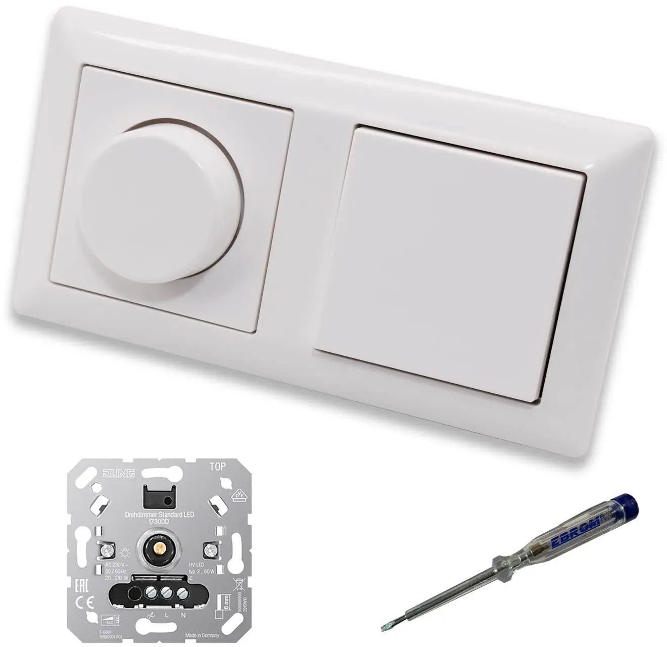 Gesamtsortiment IT + Multimedia PC Komponenten Gehäuse Case Modding Schalter + Taster Elektronik und elektronische Komponenten - EAN:4011377125858 - Die Wippe von JUNG ist ein hochwertiges Bedienelement, das für verschiedene Taster-Modelle konzipiert ist. Sie besteht aus lackiertem Duroplast und bietet eine langlebige und robuste Lösung für die Steuerung von elektrischen Geräten. Mit einem kompakten Mass von 55 x 55 mm passt sie in gängige Schalterdosen und ist einfach zu installieren. Die Wippe ist in einer eleganten Aluminium-Optik gehalten und verfügt über ein Symbol für 'Klingel', das eine intuitive Nutzung ermöglicht. Diese Wippe ist nicht nur funktional, sondern auch ästhetisch ansprechend und fügt sich harmonisch in verschiedene Wohn- und Arbeitsumgebungen ein. Sie ist für den Einsatz in trockenen Innenräumen geeignet und bietet eine Schutzart von IP44, was sie vor Spritzwasser schützt. Die Wippe ist eine ideale Wahl für alle, die Wert auf Qualität und Design legen. - Material: Duroplast, lackiert für Langlebigkeit - Geeignet für Taster-Modelle: 531 U, 532 U, 533 U, 533-2 U - Schutzart IP44 für zusätzlichen Schutz - Symbol 'Klingel' für intuitive Bedienung. - gefunden von Kelkoo Dieses Set bietet eine umfassende Lösung mit Dimmer und Taster, ideal für eine komplette Lichtsteuerung. ![]() ![]() EBROM SET IDEE: JUNG 1730DD LED Drehdimmer Dimmer + Dimmerscheibe A1740WW und Lichttaster Taster 531U in alpinweiß glänzend inklusive EBROM Phasenprüfer zur Montage der Geräte u.A. 1730 DD
