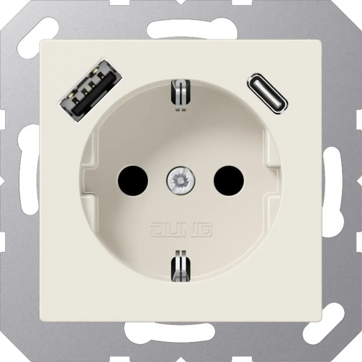 9 Händlerangebote bei billiger.de - Kategorie: Steckdosen - Jung - mit integriertem erhöhten Berührungsschutz (Safety Plus) mit 1 USB-Buchse Typ A und 1 USB-Buchse Typ C mit Federklemmen für starre und unbehandelte flexible Leiter bis 2,5 mm2 Verbindungsklemmen nach DIN VDE 0620 Montage in Gerätedose mit Abmessungen nach DIN 49073 Tiefe der Gerätedose (Innenmaß): min. 57 mm Material: Thermoplast - GTIN:4011377184312 Diese Jung SCHUKO Steckdose mit USB Typ AC in Alpinweiß bietet eine vielseitige Ladelösung für verschiedene Geräte. ![]() 342032 / Contorion Jung SCHUKO Steckdose mit USB Typ AC A1520-15CAWW)
