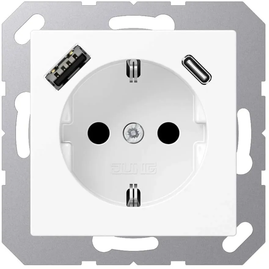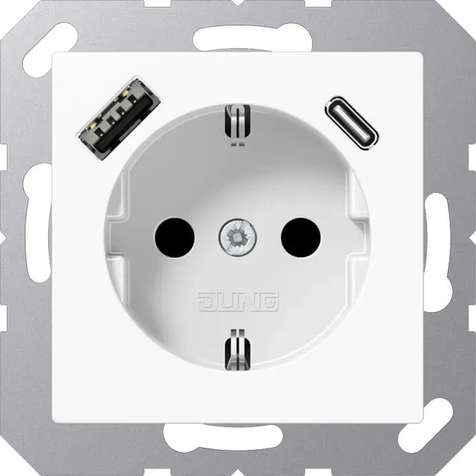Stromanschlüsse & Steckdosen Gesamtsortiment Baumarkt + Garten Elektrobedarf Schalter + Dosen Steckdose Elektronik und elektronische Komponenten - EAN:4011377187580 - Die A1520-18CWWM Einbausteckdose von JUNG kombiniert Funktionalität mit modernem Design. Diese Steckdose ist mit einer USB-Buchse vom Typ C ausgestattet, die eine Schnellladefunktion bietet, um mobile Geräte effizient mit Energie zu versorgen. Der integrierte erhöhte Berührungsschutz sorgt für zusätzliche Sicherheit, während die Federklemmen eine einfache und sichere Verbindung für starre und unbehandelte flexible Leiter bis zu 2,5 mm² ermöglichen. Die Montage erfolgt in einer Gerätedose nach den geltenden DIN-Normen, was die Installation vereinfacht und die Kompatibilität gewährleistet. Hergestellt aus lackiertem Thermoplast, ist die Steckdose sowohl robust als auch ästhetisch ansprechend und eignet sich ideal für den Innenbereich. Mit einer Einbautiefe von 48 mm passt sie in die meisten Standard-Gerätedosen und bietet eine zuverlässige Lösung für moderne elektrische Anforderungen. - Integrierter erhöhter Berührungsschutz (Safety Plus) - Schnellladefunktion über USB-Buchse Typ C - Federklemmen für starre und unbehandelte flexible Leiter bis 2,5 mm² - Montage in Gerätedose nach DIN 49073 - Hergestellt aus lackiertem Thermoplast. - gefunden von Kelkoo Diese Premium-Steckdose mit USB Typ AC und erhöhtem Berührungsschutz in Schneeweiß matt bietet maximale Sicherheit und Komfort. ![]() ![]() Jung A1520-15CAWWM SCHUKO-Steckdose mit USB Typ AC (3A) mit erhöhtem Berührungsschutz (Thermoplast bruchsicher) Schneeweiß Matt Serie A
