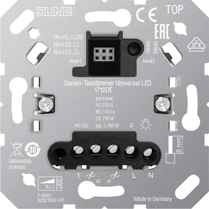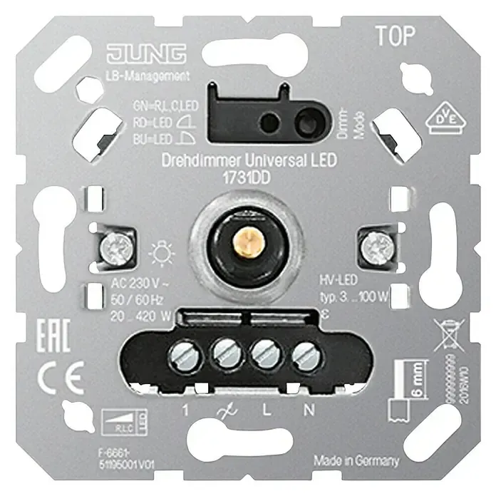 Zustand: Neu - Dimmschalter - JUNG Jung - 1724DM 1724 DM - EAN: 4011377158733 - Dimmer - bei Amazon.de Der Jung LED-Dimmer Universal 1731 DD (Metall) bietet eine robuste Ausführung und ist eine zuverlässige Wahl. ![]() ![]() Jung LED-Dimmer Universal 1731 DD (Metall)