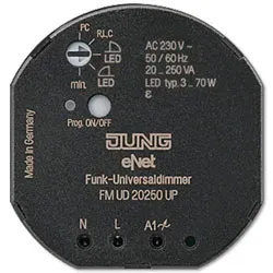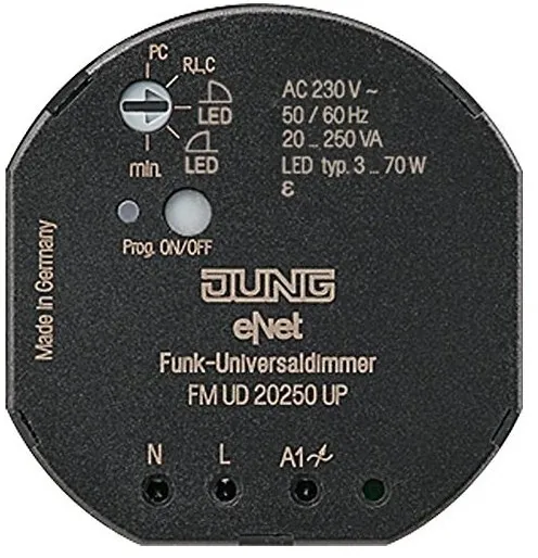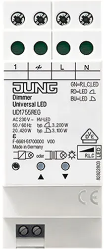 Kategorie: Schalter - Jung - GTIN:4011377086876 - Jung eNet Funk-LED-UniversaldimmerBestimmungsgemäßer Gebrauch:-Schalten und Dimmen von Glühlampen, HV-Halogenlampen, Tronic-Trafos mit Halogenlampen, dimmbaren induktiven Trafos mit Halogen- oder LED-Lampen, HV-LED- und Kompaktleuchtstofflampen-Bedienung mit geeigneten Funksendern-Montage in Gerätedose nach DIN 49073 in Kombination mit einer geeigneten Abdeckung-Montage in Aufputzgehäuse oder in Einbaugehäuse (Art.-Nr. FM-EBG) für ZwischendeckenProdukteigenschaften:-Einschalten durch lampenschonenden Softstart-Einschalthelligkeit dauerhaft speicherbar-Minimalhelligkeit dauerhaft speicherbar-Szenenbetrieb möglich-Statusanzeige mit LED-Statusrückmeldung an Funksender-Mit Taste Prog schaltbar-Elektronischer Kurzschlussschutz mit dauerhafter Abschaltung spätestens nach 7 Sekunden-Elektronischer übertemperaturschutz-Automatische oder manuelle Einstellung des zur Last passenden Dimmprinzips-Leistungserweiterung durch Leistungszusätze möglich. In Kombination mit Leistungszusätzen keine HV-LED- oder Kompaktleuchtstofflampen anschließen.Mit eNet-Server einstellbar:-Maximalhelligkeit-Dimmgeschwindigkeit-Ein-/ Ausschaltverzögerung-Auf-/ Abdimmrampe-Abschaltvorwarnung-Bediensperren-Dauer-Ein, Dauer-Aus-Hotelfunktion-Nachlaufzeit-LichtregelungZusatzfunktionen mit eNet-Server:-Update der Gerätesoftware-Repeaterfunktion-Fehlerspeicher auslesenTechnische Daten: Nennspannung: AC 230 V ~, 50/60 Hz Verlustleistung: max. 1,5 W ... Der Jung REG-Dimmer Universal LED, 1-kanalig, ist eine gute Option für die Hutschienenmontage im Verteilerkasten. ![]() ![]() Jung REG-Dimmer Universal LED , 1-kanalig