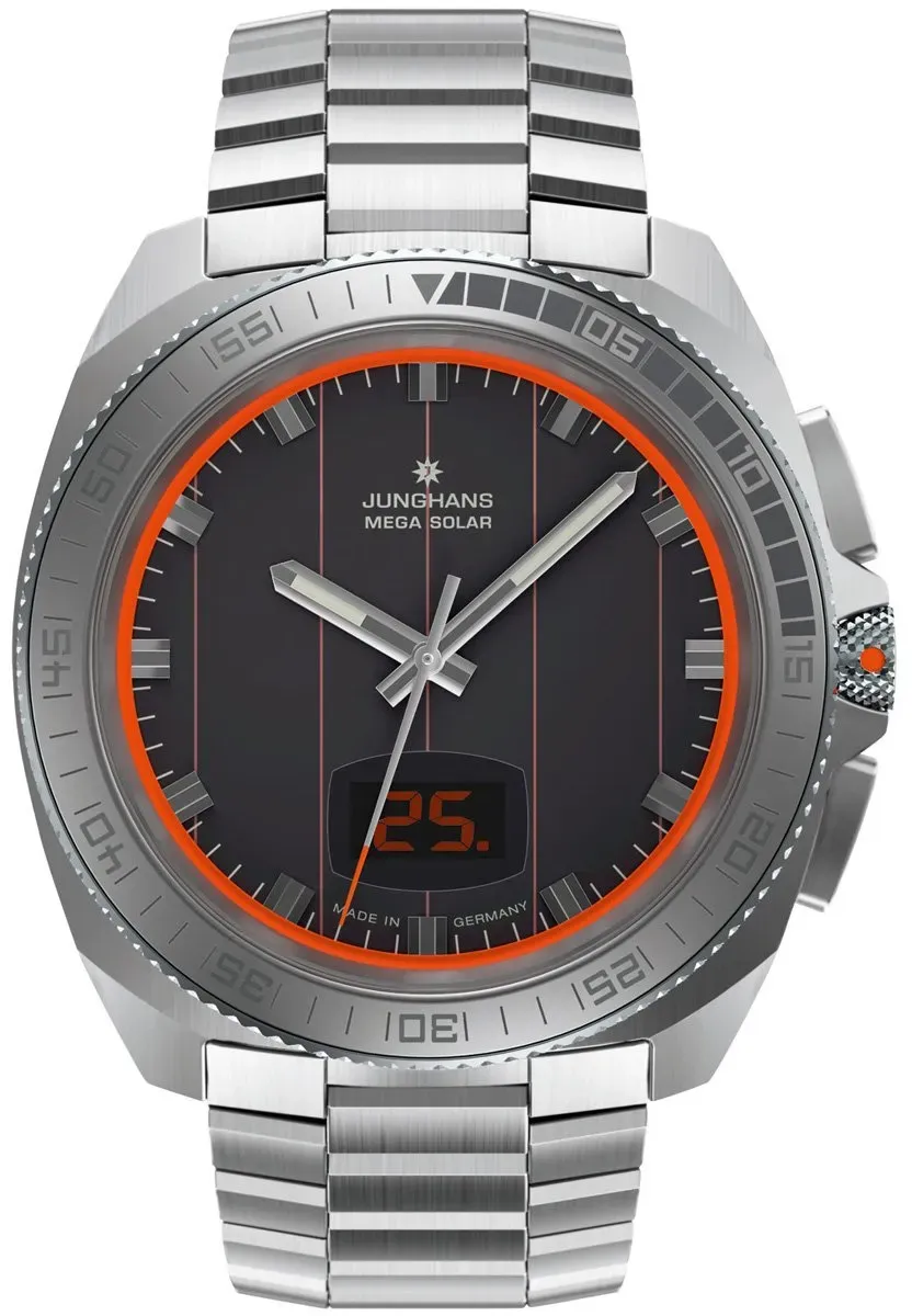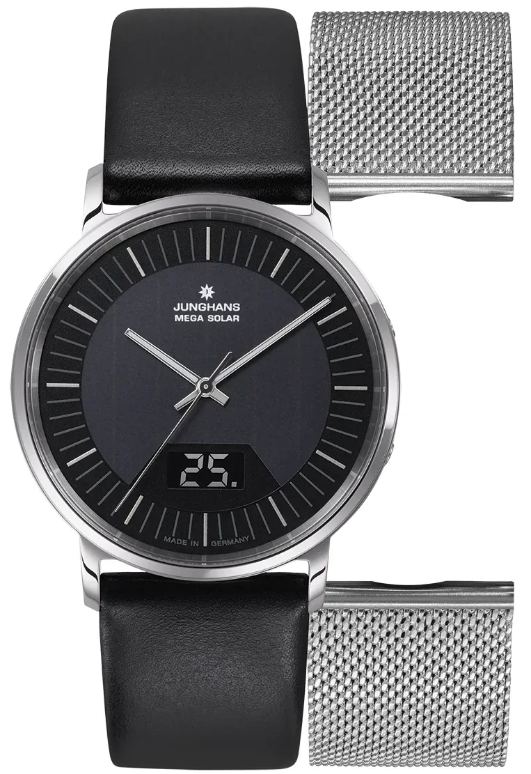 Verfügbarkeit: 1-3 Werktage - Kategorie: Herrenuhren - JUNGHANS - GTIN:4000897388935 - klassische Funk-Solar Herren-Armbanduhr, Gehäuse aus poliertem Edelstahl, kratzbeständiges synth. Saphirglas, schwarzes Glaszifferblatt mit Appliquen, polierte silberfarbige Balkenindizes in Minuteneinteilung, 3 silberfarbige Zeiger, Stunden- und Minutenzeiger mit umweltfreundlicher Super Luminova Leuchtmasse, digitales Displayfenster für Datum / Empfangskontrolle und 'Low Bat'Anzeige bei 6 Uhr, präzises Multifrequenz-Funk-Solarwerk J615.84 empfängt die Sender DCF77(Europa) - JJY40/JJY60(Japan) und WWVB(USA), Dunkelgangreserve bis zu 21 Monaten, Sleepmode nach 72 Stunden, bedampfter Mineralglasboden, bis 5 ATM wasserdicht, schwarzes Kalbslederband mit Dornschließe aus Edelstahl, zusätzlich wird ein Edelstahl-Milanaiseband mit verschiebbarer Klappschließe und Sicherheitsbügel mitgeliefertGehäusedurchmesser: 39,2 mm Gehäusehöhe: 8,4 mm Bandanstoß: 21 mm Gewicht mit Led... - 790,00 Euro bei juwelier-dietz.de - gefunden von billiger.de Für 890 Euro erhalten Sie eine Junghans Herren-Armbanduhr XL 1972 Mega Solar, die ein klassisches Design mit moderner Technik verbindet. ![]() ![]() Junghans Herren-Armbanduhr XL 1972 Mega Solar Analog Quarz Edelstahl 056/4211.44