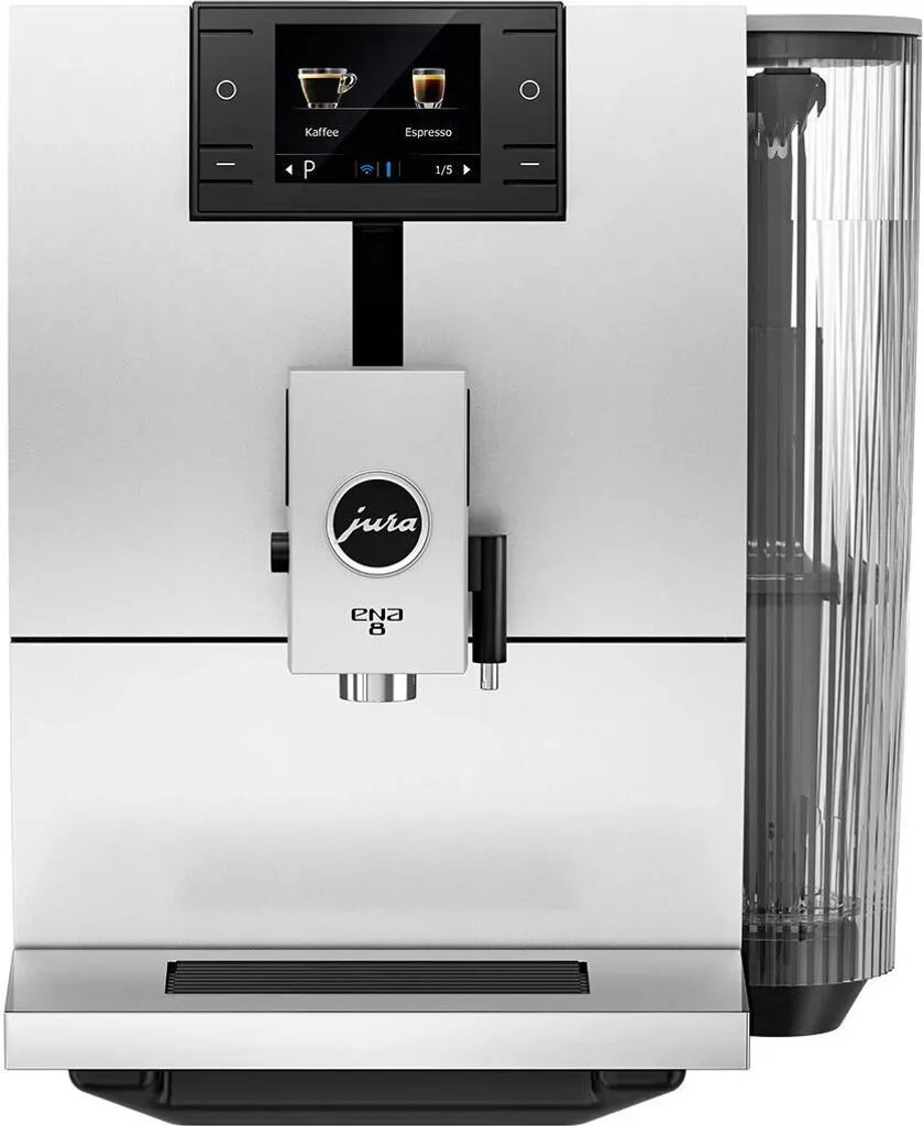 Kategorie: Kaffeevollautomaten - Jura - GTIN:7610917155972 - JURA ENA 8 Signature Line Kompakter Luxus mit massivem Aluminiumgehäuse Die JURA ENA 8 Signature Line vereint präzise Kaffeetechnologie und minimalistisches Design auf kleinstem Raum. Der edle Vollautomat überzeugt durch sein massives 3 mm Aluminium-Gehäuse, den modernen Professional Aroma Grinder und feinste Milchschaum-Technologie. Kompakt, leistungsstark und stilvoll perfekt für alle, die keine Kompromisse zwischen Genuss und Design eingehen möchten. Design-Statement in Aluminium Dark Inox Als einziger JURA-Vollautomat ist die ENA 8 rundum mit hochwertigem 3 mm starkem Aluminium verkleidet. Diese außergewöhnliche Materialwahl sorgt nicht nur für Langlebigkeit, sondern setzt das klare, geometrische Design gekonnt in Szene. Der diamantgeschliffene Wassertank in Kristalloptik und verchromte Details runden das Gesamtbild stilvoll ab. 15 Spezialitäten kompakt und vielfältig Espresso, Kaffee, Doppio Cappuccino, Flat White, Latte Macchiato Cortado, Barista Caff 2 Tassen-Funktion für Espresso & Kaffee Heißwasser & Milchschaumportion Extra Shot-Funktion für mehr Intensität Technologie auf höchstem Niveau Professional Aroma Grinder 12,2 % mehr Aroma dank präziser Mahlung Feinschaum-Technologie luftig-leichter Milchschaum für perfekte Spezialitäten Zwei-Tassen-Funktion zwei Kaffees gleichzeitig, ohne Kompromisse TüV-zertifizierte Hygiene automatische Milchsystem-Reinigung auf Knopfdruck Bedienung per Touch oder ... Dieses Angebot der ENA 8 Nordic White inklusive 2 kg Kaffee ist ideal für alle, die sofort mit dem Kaffeegenuss starten möchten. ![]() ![]() JURA Kaffeemaschine ENA 8 Nordic White - einschließlich 2 kg Kaffee - Weiß