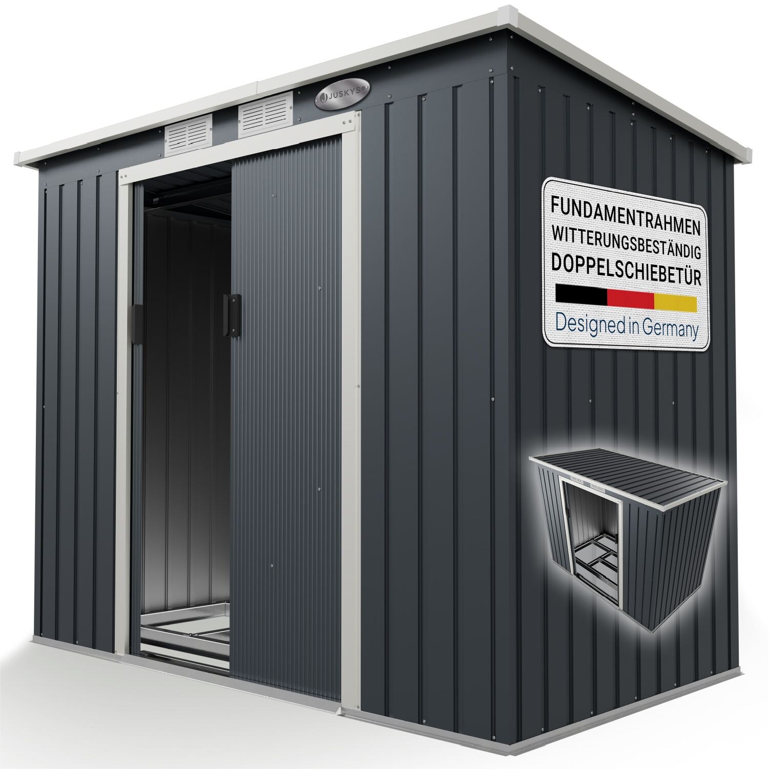 8 Händlerangebote bei billiger.de - Kategorie: Gartenhäuser - Juskys - Mit dem modern gehaltenen Metall Gerätehaus S mit Pultdach in Dunkelgrau sorgen Sie stilvoll für Ordnung im Garten oder auf der Terrasse. Verstauen Sie hier ganzjährig Werkzeuge, Gartengeräte oder Spielzeug sauber und trocken. Das kompakte Metallgerätehaus - GTIN:4262437186504 ![]() Juskys Metall Gerätehaus Geräteschuppen S - Pultdach, Schiebetür & Fundamentrahmen 1 m anthrazit