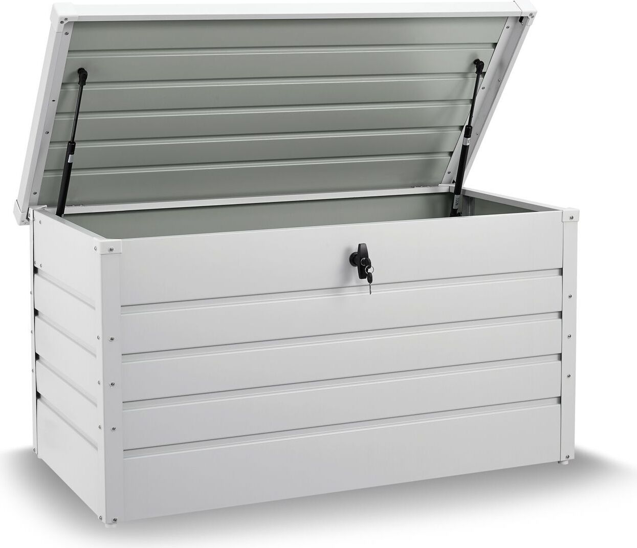 Kategorie: Sonstige Gartenmöbel - Juskys - GTIN:4260565529118 - Wasserdichte Gartenbox zu sicheren Aufbewahrung - 127,99 Euro bei Juskys - gefunden von billiger.de ![]() ![]() Juskys Metall Aufbewahrungsbox Limani 380 Liter - Outdoor Box - wasserdicht, abschließbar - Gartenbox, Auflagenbox, Kissenbox für Garten Weiß