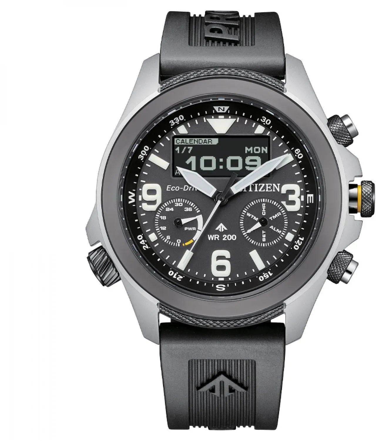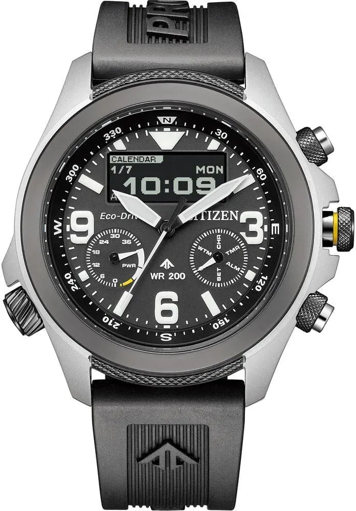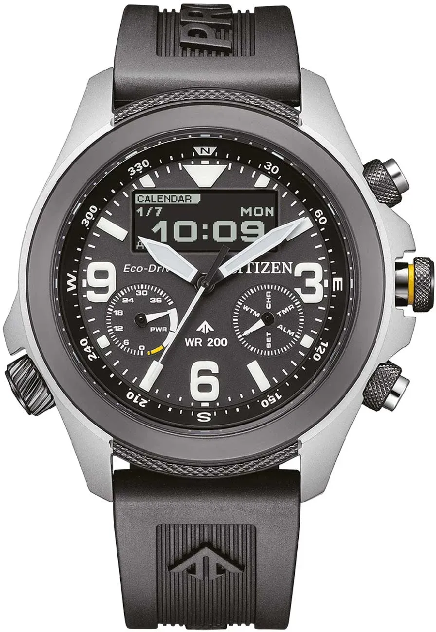 12 Händlerangebote bei billiger.de - Kategorie: Chronographen - Citizen - Sei bereit für das Abenteuer mit dem neuesten, einsatzbereiten Zeitmesser aus der Promaster Land-Serie von Citizen. Diese Analog-Digitaluhr verfügt über eine Kalenderfunktion: Wochentag-Datum sowie Solarenergie, Stoppuhr, Weltzeit, Alarm und leuchtende Zeiger. Diese hochwertige Uhr hat ein Schwarz Kunststoff Band ( 21 cm Länge und 21 mm Breite) mit einer Dornschließe Gehäusedurchmesser: 45 mm,Gehäuse Höhe: 14 mm, Gehäusefarbe: Silber, Zifferblattfarbe: Schwarz Wasserdicht: 20 bars -Gewicht: 115 g Die Uhr wird in eine original Geschenkbox geliefert und hat - GTIN:4974374342546 ![]() ![]() Citizen Watch JV1007-07E