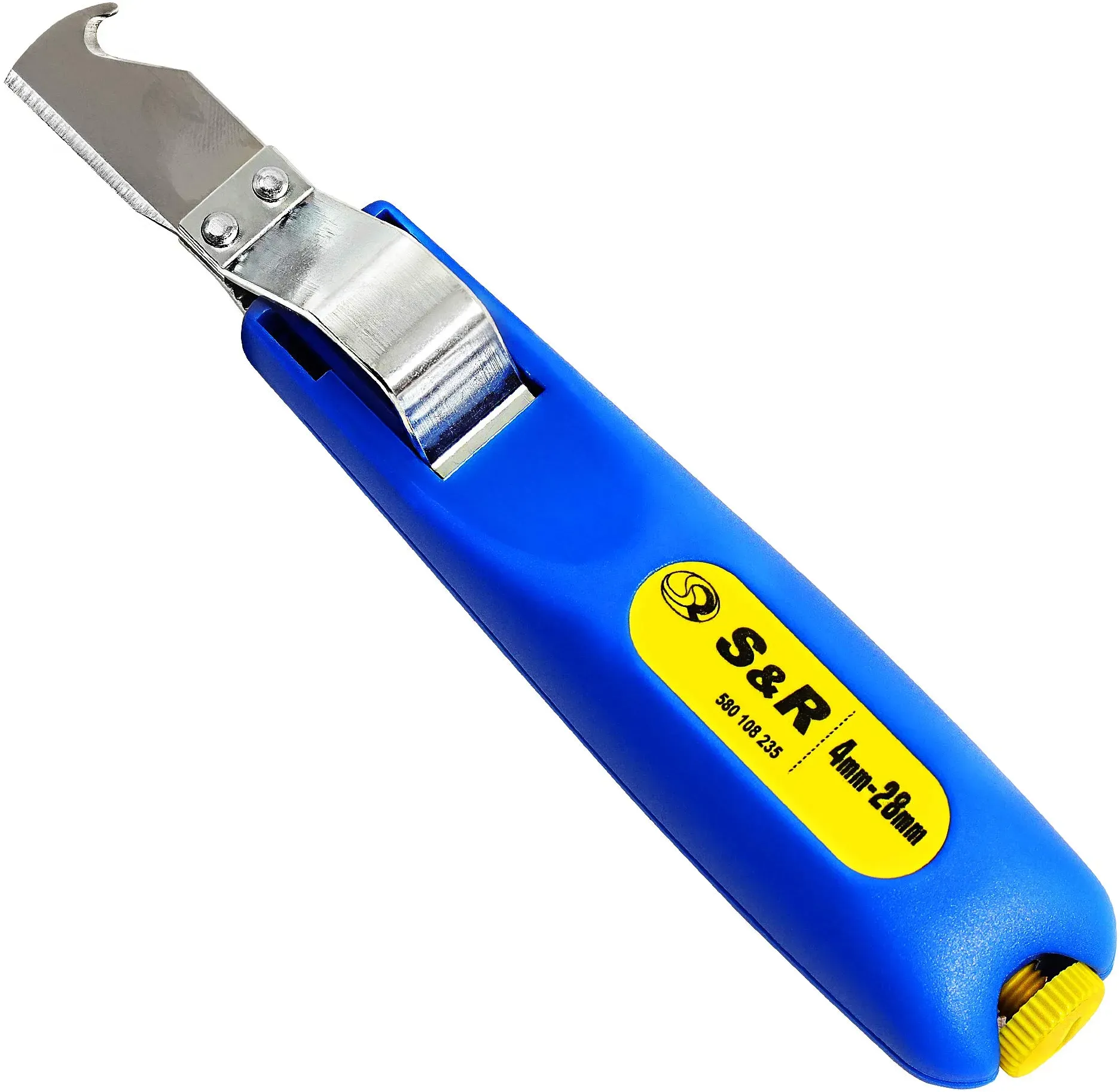 Zustand: Neu - Abisolierzangen - SmartPack - AZ001 - EAN: 0042764699755 - Abisolierzange aus Chrome-Vanadium Stahl., langlebid und robust. Mit präzisions-Öffnungsfeder. Bis 1000 V. Handbetrieben. Spezial CrV erkzeugstahl, geschmiedet, ölgehärtet. Länge 160 mm. Einfache Verstellung auf den gewünschten Drahtdurchmesser durch Rändelschraube und Kontermutter. Für ein-, mehr- und feindrähtige Leiter mit Kunststoff- oder Gummiisolation, max. 5 mm oder 10 mm² Leiterquerschnitt. - Verkäufer: Bassel EU im amazon.de Marketplace Dieses Kabelmesser mit Schleppklinge ist besonders vielseitig für Kabel von 4-28mm und bietet eine gute Ergonomie. ![]() ![]() S&R Kabelmesser: Vielseitiges Abisolierwerkzeug, Kabel-Entmantler und Abisolierer mit Schleppklinge Das Abmantelungsmesser für Kabel 4-28mm, Elektrikermesser und Kabelspleißmesser