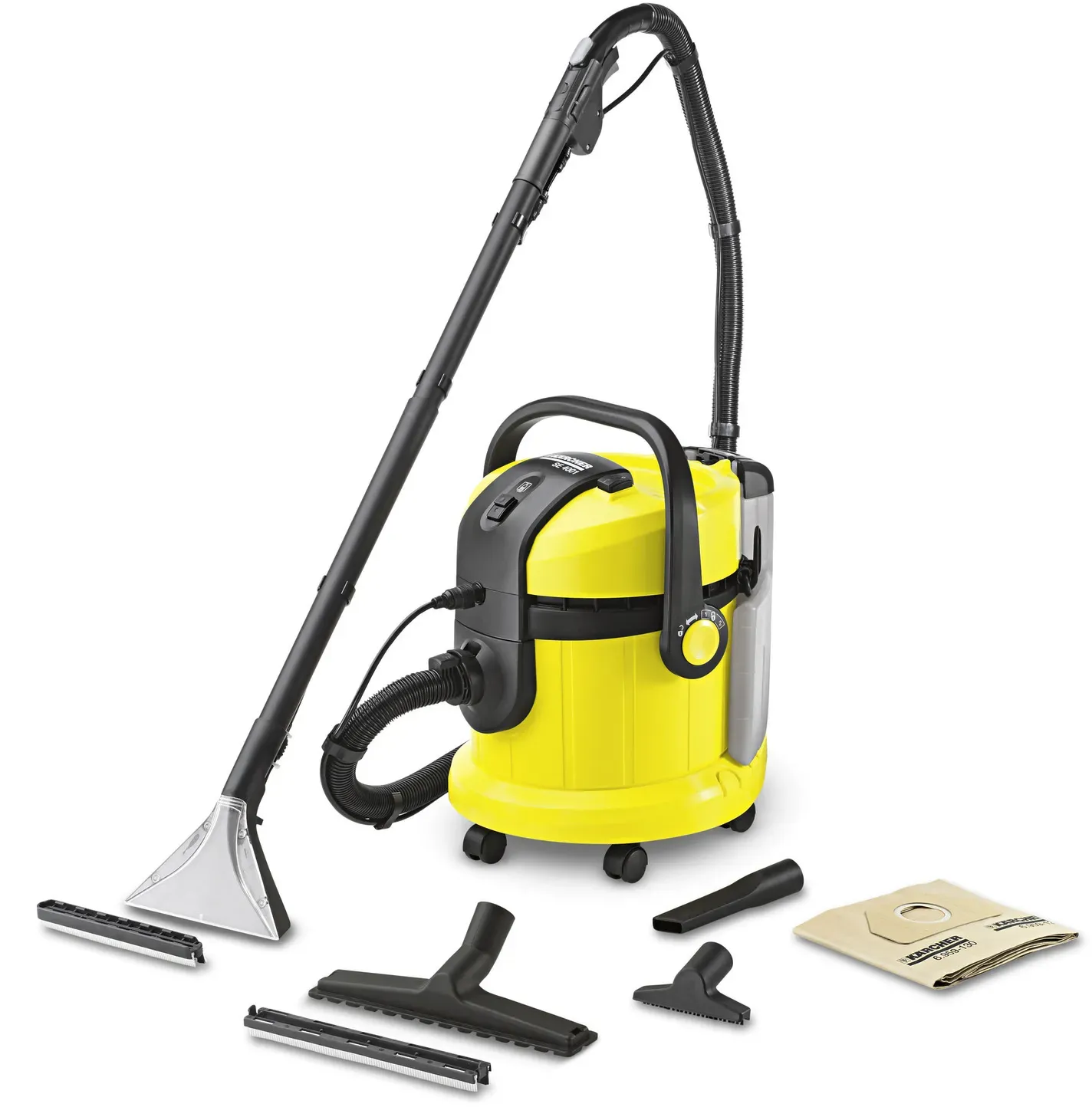 Zustand: Neu - Waschsauger - Kärcher - 1.081-130.0 SE 4001 - EAN: 4039784254138 - Der Waschsauger SE 4001 reinigt textile Flächen besonders gründlich. Das Sprühextraktionsgerät gewährleistet fasertiefe Hygiene und eignet sich auch für Allergiker und Haushalte mit Tieren Frisches Leitungswasser und der Kärcher Teppichreiniger RM 519 werden mit Druck tief in die textilen Flächen eingesprüht und zusammen mit dem gelösten Schmutz wieder abgesaugt Dank innovativer Düsentechnologie sind die gereinigten Flächen 50 Prozent schneller wiederbegehbar Dank der umfangreichen Zubehöre kann das Gerät auch als vollwertiger Mehrzwecksauger eingesetzt werden Lieferumfang: Sprühsaugschlauch 2m, Sprühsaugrohre 2x, Waschdüse mit Hartbodenaufsatz, Nass-/Trockensaugdüse, Trockensaugdüse, Fugendüse, Polsterdüse, Schaumstofffilter, Teppichreiniger RM 519 100 ml, Vliesfilterbeutel 1 Stück - 1 Händler im amazon.de Marketplace ![]() ![]() Kärcher Kärcher Waschsauger SE 4001 (für die Reinigung von Hartflächen, textilen Oberflächen und Polstern), Schwarz, Gelb