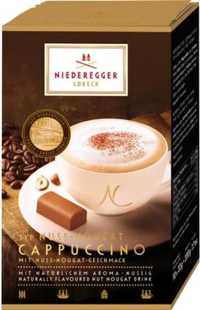 Verfügbarkeit: 1-4 Werktage - 23,64 €/kg - Kategorie: Kaffee & Espresso - Niederegger - GTIN:4000161850328 - Die bekannte italienische Kaffee-Spezialität verfeinert mit einer köstlichen Nuss-Nougat-Note. Den Inhalt eines Beutels in eine Tasse geben und mit heißem, nicht mehr kochenden Wasser auffüllen.Inhalt 10 Beutel, gesamt 220 GrammKaffeehaltiges Getränkepulver, Typ Cappuccino Nuss-Nougat - Zucker, MAGERMILCHPULVER, SüßMOLKEPULVER, löslicher Kaffee 9 %, Glukosesirup, Kokosfett, stark entöltes Kakaopulver 4 %, MOLKENPROTEINKONZENTRAT, natürliches Aroma, Speisesalz, Stabilisator: E 340In einem trockenen und kühlen Ort lagern.Nährwerteje 100g/100mlEnergie (kJ/kcal)(1.669 / 395)Fett - davon gesättigte Fettsäuren:5,6 g 4,8 gKohlenhydrate - davon Zucker:72,3 g 60 gEiweiß11,4 gSalz0,89 g Verantwortlicher Unternehmer: J.G. Niederegger GmbH & Co. KG, Zeißstr. 1-7, 23560 Lübeck, DeutschlandInformationen zum Unternehmen €žNIEDEREGGER€œAus Liebe seit 1806.Im Jahre 1806 wurde das Unternehmen Niederegger vom Konditormeister Johann Georg Niederegger gegründet. Er verhalf dem Unternehmen zu dem Ruhm, den das Niederegger Marzipan bis heute in der ganzen Welt genießt. In den nun über 20 n seines Bestehens ist das Café Niederegger im Herzen der Hansestadt zum heimlichen Wahrzeichen Lübecks geworden.Marzipan in höchster Qualität.Das Geheimnis des Niederegger Marzipans wird im Familienunternehmen von Generation an Generation weitergegeben. Der wichtigste ... HEARTS Cappuccino Karamell ist ein Instant-Kaffeepulver mit einer angenehmen Karamellnote für süße Kaffeemomente. ![]() ![]() HEARTS Cappuccino - Karamell 1kg eBay Instant Kaffeepulver mit angenehmer Karamellnote