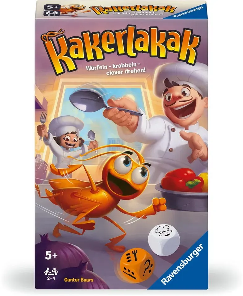 Ravensburger - EAN: 04005556224463 - Hungrig flitzt die Kakerlake durch die Küche. Mit etwas Würfelglück und einem cleveren Dreh am Besteck gelangt sie schnell zu den Leckereien. Doch sobald der Koch erscheint, ist es sofort vorbei! Mit einfacher Einstiegs- und rasanter Actionregel. Hungrig flitzt die Kakerlake kreuz und quer durch die Küche und sucht nach Leckereien. Wenn nur nicht das Besteck herumliegen würde dauernd muss sie es aus dem Weg räumen, um ans Ziel zu kommen. Plötzlich taucht der Koch auf jetzt aber nichts wie weg! Wer sammelt zuerst die vier Leckereien seiner Speisekarte und krabbelt danach wieder zurück in sein Versteck? Die Kakerlaken sind los: Das Mitbringspiel des beliebten Spieleklassikers für Kinder und Erwachsene. Die mitspielenden Personen drehen clever das Besteck und versuchen die Kakerlake in die Falle zu locken Super einfache Spielregeln und ein schneller Spielaufbau sorgen dafür, dass gleich losgespielt werden kann. Die kurze Spieldauer von 15-20 Minuten machen dieses Familienspiel zu einem kurzweiligen Zeitvertreib Bereits mehr als 4 Millionen verkaufte Spiele weltweit und zahlreich gewonnene Preise machen die Kakerlakak-Spiele zu einer der erfolgreichsten Kinderspiel-Reihen in Deutschland Ein Muss für jedes Kinderzimmer und ein super Geschenk zum Geburtstag oder zu Weihnachten Die Mitbringspiele von Ravensburger sind speziell auf die verschiedenen Altersgruppen abgestimmt und überzeugen durch eine hochwertige Qualität. Das kompakte Format ... Für nur 6.11 Euro erhalten Sie hier ein Ravensburger Kakerlakak Kinderspiel, Made in Europe. ![]() ![]() Ravensburger Spiel Kakerlakak, Kinderspiel, Made in Europe bunt
