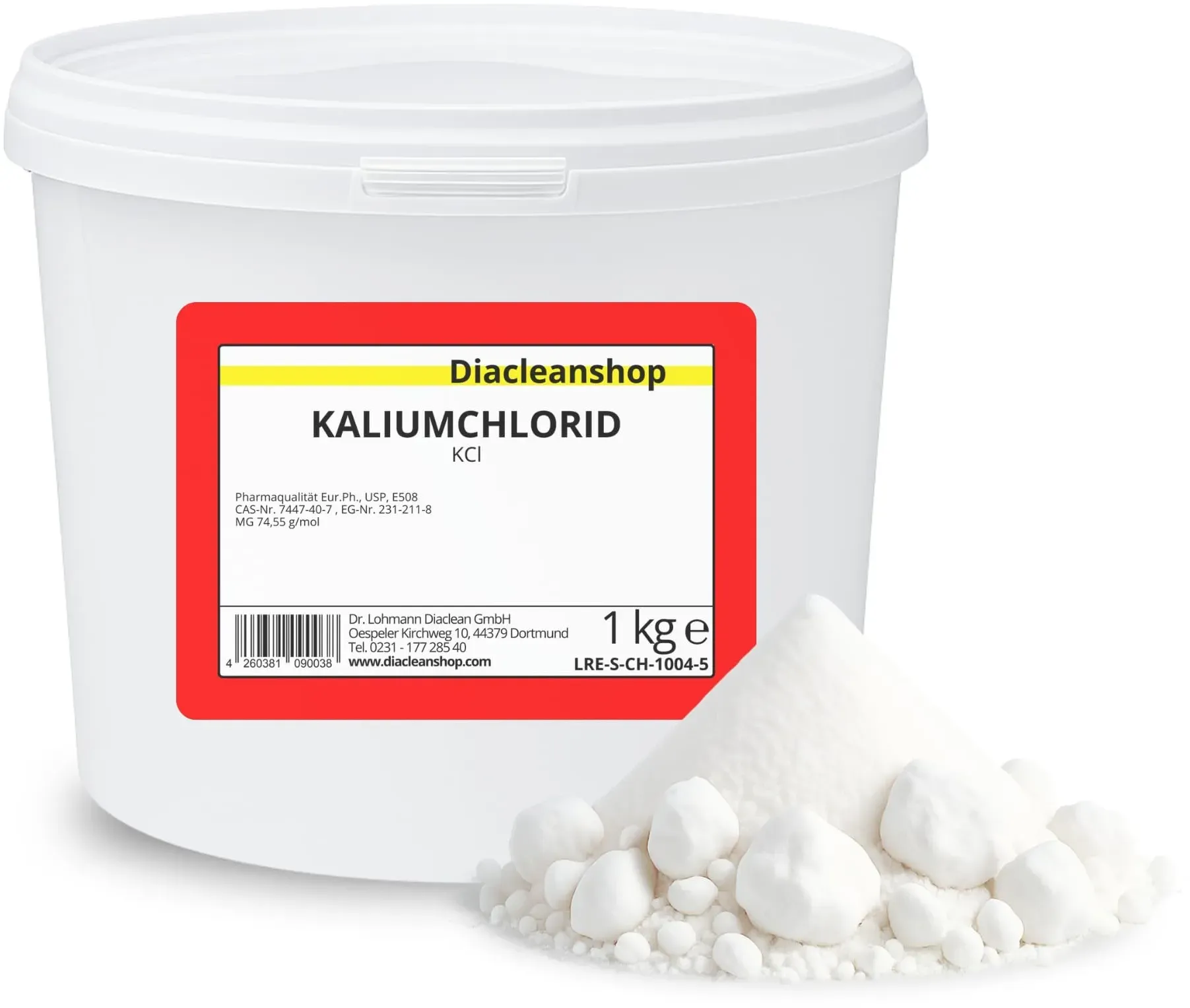 Zustand: Neu - 18,99 € / kg - Laborchemikalien - DIACLEANSHOP Dr. Lohmann DIACLEAN GmbH - LRE-S-CH-1004-5 - EAN: 4260381090038 - Pharmaqualität - reiner als Lebensmittelqualität als Lebensmittelzusatz E508 Täglich abgefüllt im Eimer mit Originalitätsverschluss zusätzlich im Plastikbeutel im Eimer verpackt - Verkäufer: diacleanshop im amazon.de Marketplace ![]() ![]() Diacleanshop Kaliumchlorid Diätsalz 1kg KCl - chem. rein E508