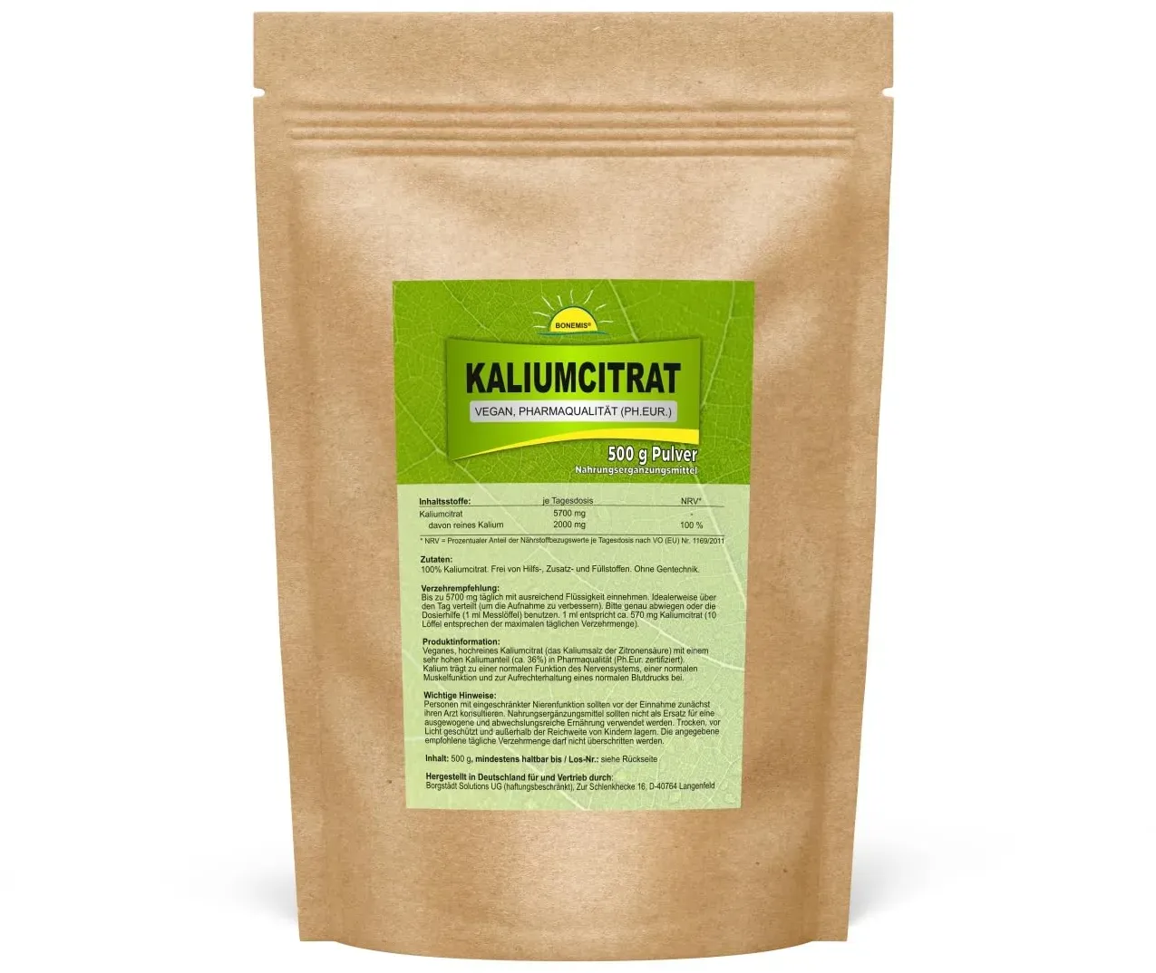 Kategorie: Nahrungsergänzungsmittel - insport nutrition - GTIN:5906746045877 - Kaliumcitrat von Insport Nutrition ist ein hochwertiges Nahrungsergänzungsmittel in Pulverform, das den Körper mit essentiellem Kalium in der bioverfügbaren Form von Citrat versorgt. Kalium ist ein wichtiger Mineralstoff, der viele physiologische Prozesse unterstützt, darunter die Regulierung des Wasser-Elektrolyt-Gleichgewichts und das reibungslose Funktionieren des Nerven- und Muskelsystems. WASSER-ELEKTROLYT-GLEICHGEWICHT - Kalium trägt zur Regulierung des osmotischen Drucks und des Flüssigkeitsgleichgewichts im Körper bei, was eine angemessene Hydratation der Zellen und ihr effizientes Funktionieren, insbesondere von Muskeln und Nerven, gewährleistet. üBERTRAGUNG VON NERVENIMPULSEN - Kalium ist an der übertragung von Nervenimpulsen beteiligt, die die motorische Koordination und die kognitiven Funktionen beeinflussen. Es ist dafür verantwortlich, dass die Nervenzelle nach der übertragung eines Impulses in ihren Ruhezustand zurückkehrt. KNOCHENGESUNDHEIT - Kalium trägt zur Erhaltung der Knochengesundheit bei, indem es Säuren neutralisiert, die zur Demineralisierung der Knochen führen können. VEGAN UND VEGETARISCH: Dieses Produkt ist zu 100 % für Veganer und Vegetarier geeignet und somit eine ausgezeichnete Wahl für alle. - 9,50 Euro bei Amazon Marketplace Health & Personal Care - gefunden von billiger.de Das Bene Vobis Kaliumcitrat Pulver ist mit 10.35 Euro für 500g eine sehr günstige Option. ![]() ![]() Bene Vobis - Kalium (Kaliumcitrat) eBay Pulver 500g