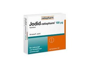 Gesundheitskategorien Nahrungsergänzungsmittel Mineralstoffe Eisen und Jod Vitamine & Ergänzungen - Anwendungsgebiet von Jodid / Kaliumiodid ratiopharm 100μgJodid / Kaliumiodid ratiopharm 100μg ist ein Arzneimittel zur Behandlung eines Jodmangels, sowie zur Vorbeugung und Behandlung von Schilddrüsenerkrankungen. Wirkstoffe / Inhaltsstoffe / Zutaten Kaliumjodid 131 µg (entprechen 100 µg Jodid) weitere Bestandteile: Maisstärke, Lactose-Monohydrat, Kartoffelstärke, Hochdisperses Siliciumdioxid, Magnesiumstearat (Ph. Eur.) GegenanzeigenPatienten, die auf einen der oben genannten Inhaltsstoffe überempfindlich reagieren oder an einer Schilddrüsenüberfunktion leiden, sollten das Präparat nicht einnehmen.DosierungBitte dosieren Sie Jodid / Kaliumiodid ratiopharm 100μg nach Anweisung Ihres Arztes. Bestimmte Indikationen erfordern eine angepasste Dosierung. Jodid / Kaliumiodid ratiopharm 100μg sollte nach einer Mahlzeit mit ausreichend Flüssigkeit eingenommen werden. EinnahmeNehmen Sie das Arzneimittel nach einer Mahlzeit mit ausreichend Flüssigkeit (z. B. 1 Glas Wasser) ein.PatientenhinweiseVerkehrstüchtigkeit und das Bedienen von MaschinenEs gibt keine Hinweise darauf, dass das Präparat die Fähigkeit zur Teilnahme am Straßenverkehr oder zu Arbeiten mit Maschinen und Arbeiten ohne sicheren Halt einschränkt.SchwangerschaftIn Schwangerschaft und Stillzeit besteht ein erhöhter Iodbedarf, so dass eine ausreichende Iodzufuhr besonders wichtig ist.Die Einnahme von Iod und ... Eine preiswerte Option für die tägliche Jodzufuhr in Tablettenform. ![]() JODID-ratiopharm 100 µg Tabletten 100 St