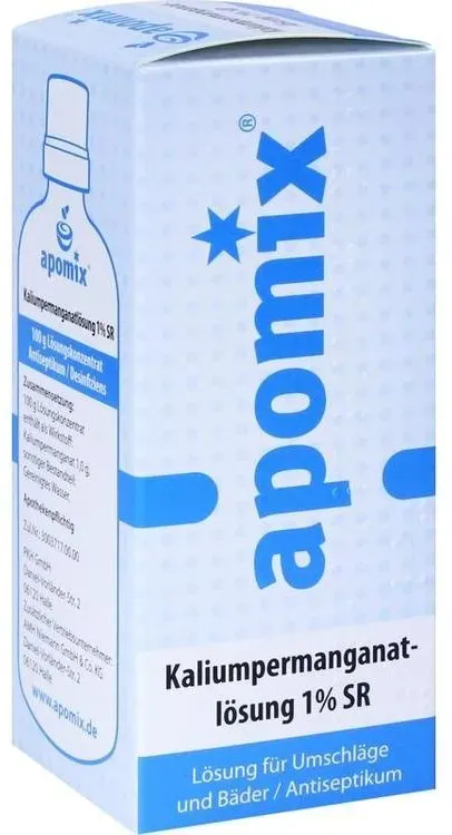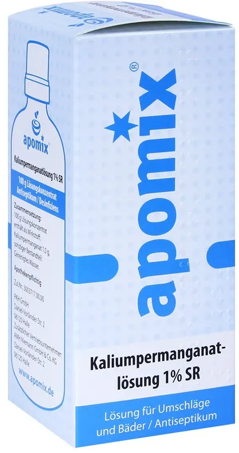 Verfügbarkeit: 1-2 Werktage - 113,90 €/l - Kategorie: Arzneimittel - apomix - GTIN:4150028306229 - PZN:02830622 - Kaliumpermanganat-lösung 1% SR 100 ml - rezeptfrei - von apomix AMH Niemann GmbH & Co. KG - Lösung - 100 ml - 8,60 Euro bei DocMorris Apotheke - gefunden von billiger.de Dieses Angebot ist eine 5%ige Kaliumpermanganat-Lösung in einer praktischen 250ml-Größe. ![]() ![]() 250ml Kaliumpermanganat - Lösung 5 eBay % - Desinfektionsmittel, Bleiche, Beize