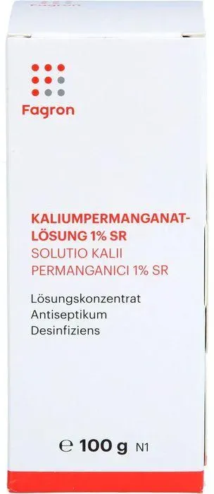Verfügbarkeit: 1-3 Werktage - 83,90 €/kg - Kategorie: Arzneimittel - Fagron GmbH - GTIN:4150010556939 - PZN:01055693 - Wichtige Hinweise (Pflichtangaben): Kaliumpermanganatlösung 1% SR. Anwendungsgebiete: Zur Keimminderung auf der Haut. Zum Bereiten von Bädern, Spülungen und Umschlägen. Zu Risiken und Nebenwirkungen lesen Sie die Packungsbeilage und fragen Sie Ihre ärztin, Ihren Arzt oder in Ihrer Apotheke. GEBRAUCHSINFORMATION: INFORMATION FüR DEN ANWENDER Kaliumpermanganatlösung 1% SR Solutio Kalii permanganici 1% SR Lesen Sie die gesamte Gebrauchsinformation sorgfältig durch, denn sie enthält wichtige Informationen für Sie! Dieses Arzneimittel ist auch ohne ärztliche Verschreibung erhältlich. Um einen bestmöglichen Behandlungserfolg zu erzielen, muss das Arzneimittel jedoch vorschriftsmäßig angewendet werden. Heben Sie die Gebrauchsinformation auf. Vielleicht möchten Sie diese später nochmals lesen. Fragen Sie Ihren Apotheker, wenn Sie weitere Informationen oder einen Rat benötigen. Wenn sich Ihr Krankheitsbild verschlimmert oder keine Besserung eintritt, müssen Sie einen Arzt aufsuchen. Stoff- oder Indikationsgruppe: Antiseptikum / Desinfiziens. Anwendungsgebiete: Zur Keimminderung auf der Haut. Zum Bereiten von Bädern, Spülungen und Umschlägen. Gegenanzeigen: Wann dürfen Sie Kaliumpermanganatlösung (Solutio Kalii permanganici) nicht anwenden? Kaliumpermanganatlösung soll bei bekannter überempfindlichkeit gegen Kaliumpermanganat nicht ... Diese apomix Kaliumpermanganat-Lösung ist eine beliebte Wahl und bei medpex.de zu einem fairen Preis erhältlich. ![]() ![]() apomix Kaliumpermanganat-lösung 1% SR 100 ml