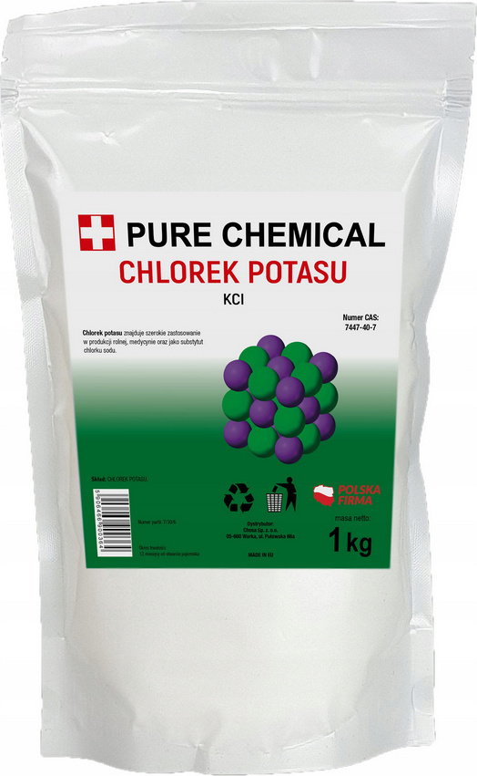 EAN: 5906466900364 - REINES KALIUMCHLORID KCl - KALIUMSALZ 99,9% - 1kgKaliumchlorid von Pure Chemical ist ein vielseitiges Produkt mit hoher Reinheit, ausgezeichneter Löslichkeit und chemischer Stabilität. Es wird am häufigsten als Kaliumdünger verwendet.Gewicht: 1 kg netto (ohne Verpackung)Form: Pulver, GranulatVerpackung: Doypack mit wiederverschließbarem VerschlussQualität: Rein, ohne ZusätzeLöslichkeit: Hervorragend wasserlöslichChemische Formel: KClEG-Nummer: 231-211-8CAS-Nummer: 7447-40-7Inhalt: KaliumchloridSicherheit: Sicher in der Anwendung, nicht toxisch und unter Standardbedingungen nicht reaktivReinheit: Mindestens 99,5% Wofür kann Kaliumchlorid von Pure Chemical verwendet werden? Landwirtschaft: Als Kaliumdünger zur Unterstützung des Pflanzenwachstums.Chemische Industrie: Zur Herstellung anderer chemischer Verbindungen.Aquaristik: Zur Mineralisierung von Aquarienwasser. Kaliumchlorid als Kaliumdünger Verwendungszweck: Kaliumchlorid wird als Dünger verwendet, um Pflanzen mit notwendigem Kalium zu versorgen.Anwendung: Eine bestimmte Menge Kaliumchlorid in Wasser auflösen und um die Pflanzen herum auf den Boden auftragen.Dosierung: In der Regel 1-2 kg pro 100 m Anbaufläche, abhängig vom Bedarf der Pflanzen und dem Zustand des Bodens. - bei kaufland.de - aus Yadore Produktdaten Dieses Kaliumsalz wird als "Salz für Blutdruckgeplagte" beworben und ist eine gute Option für Personen, die ihren Blutdruck im Auge behalten möchten. ![]() ![]() Kaliumchlorid, Kaliumsalz. Das Salz für Blutdruckgeplagte